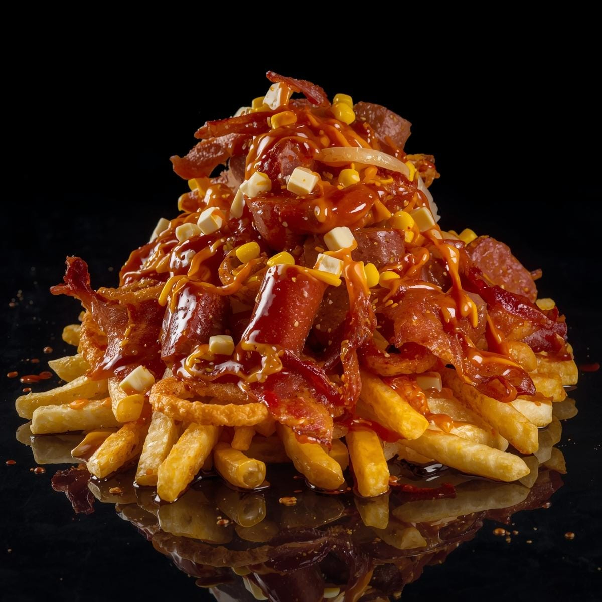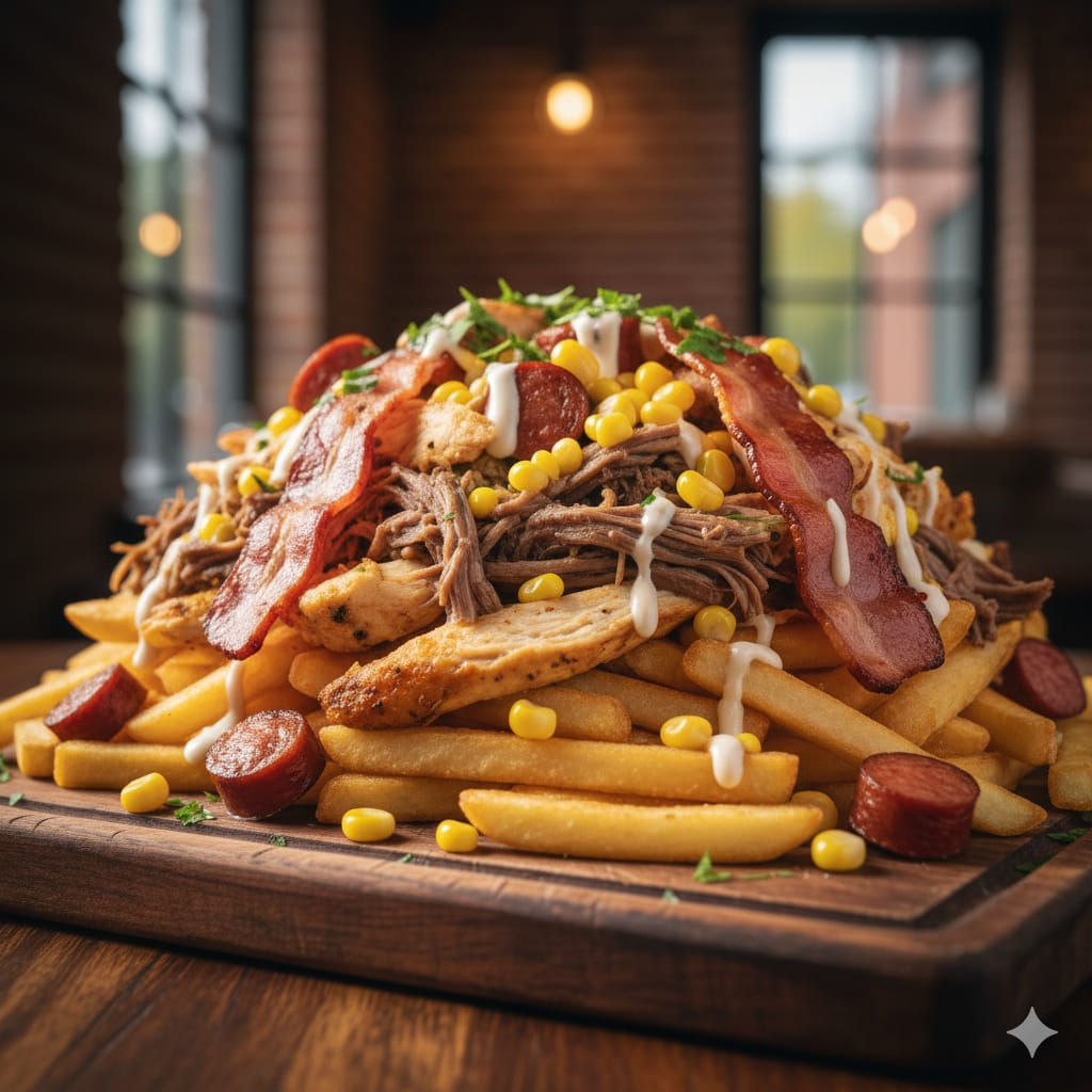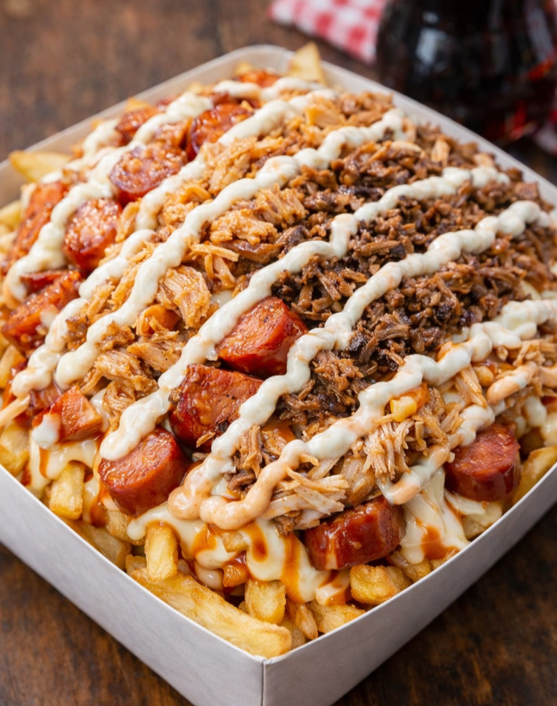 ¡La máxima experiencia! Deliciosa base de papa francesa con salchicha americana, jugosa carne desmechada y pollo desmechado, finalizada con tocineta crujiente y maíz tierno.