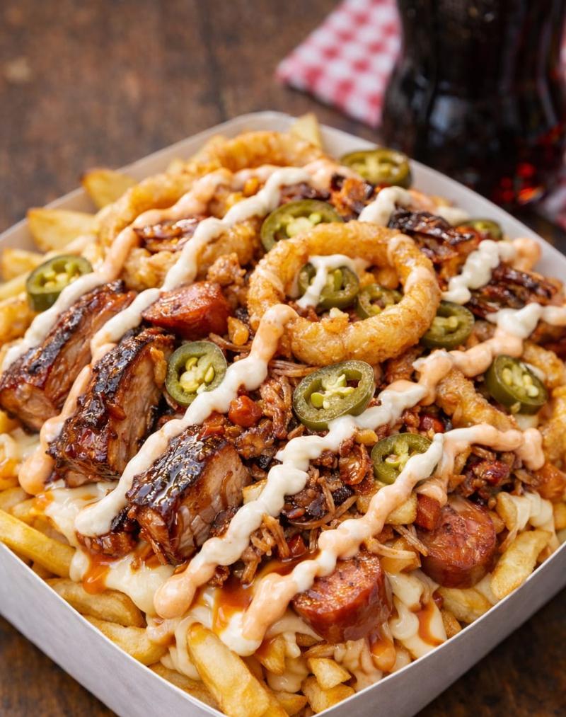 Para paladares exigentes: papa francesa con costilla ahumada, crujientes aros de cebolla, queso costeño, jalapeños picantes y salsas de la casa y ajo.