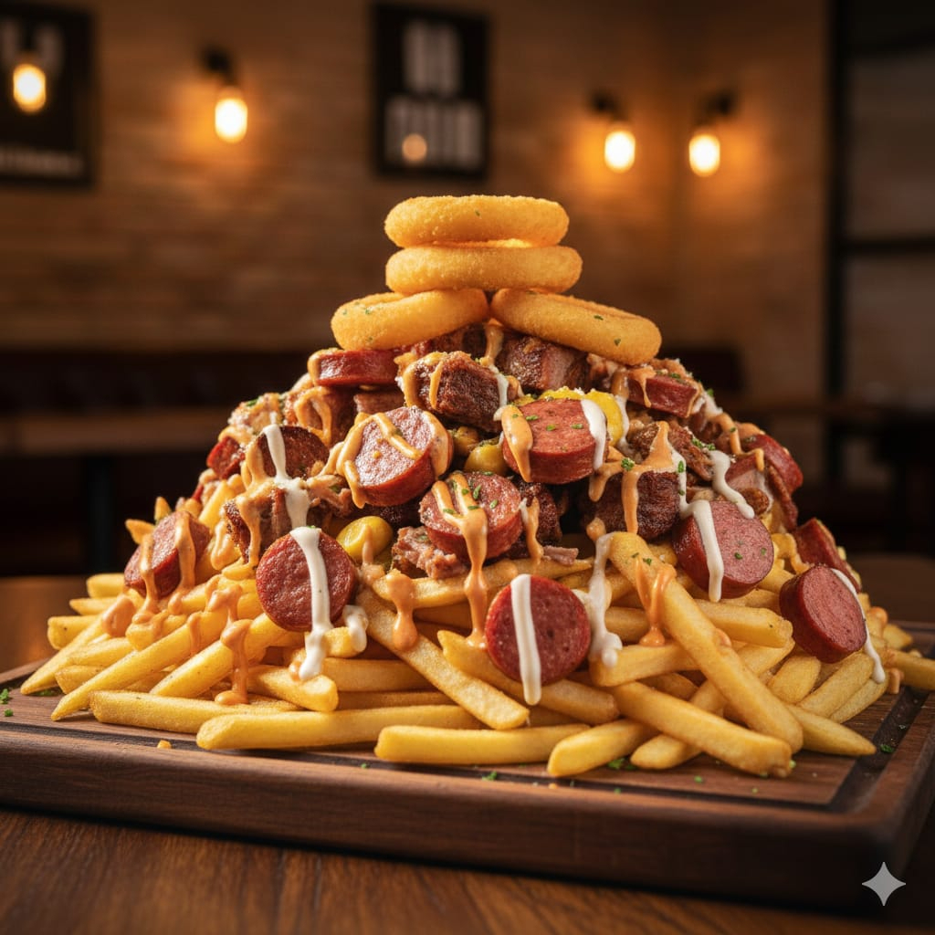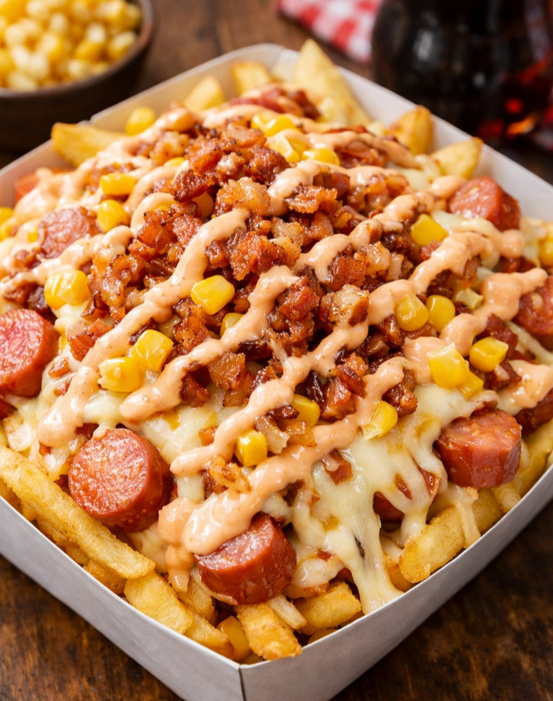 Textura crujiente inigualable: papa francesa, salchicha americana, aros de cebolla, maíz, tocineta, queso costeño y nuestras salsas de la casa y ajo.