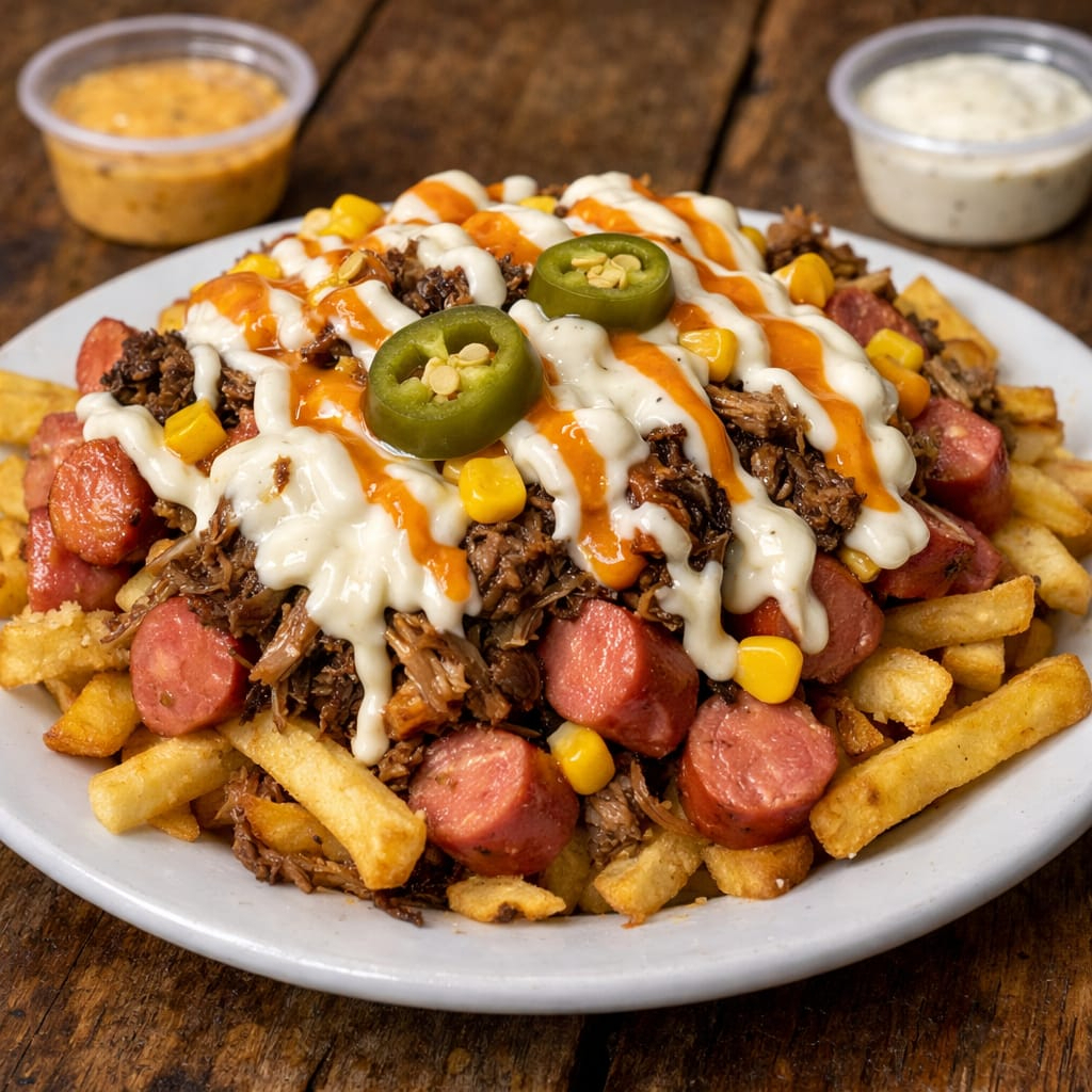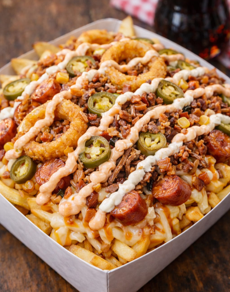 Atrévete a probar esta mezcla de papa francesa, salchicha americana y carne desmechada, con maíz, el picante de los jalapeños, queso costeño y salsas de la casa y ajo.