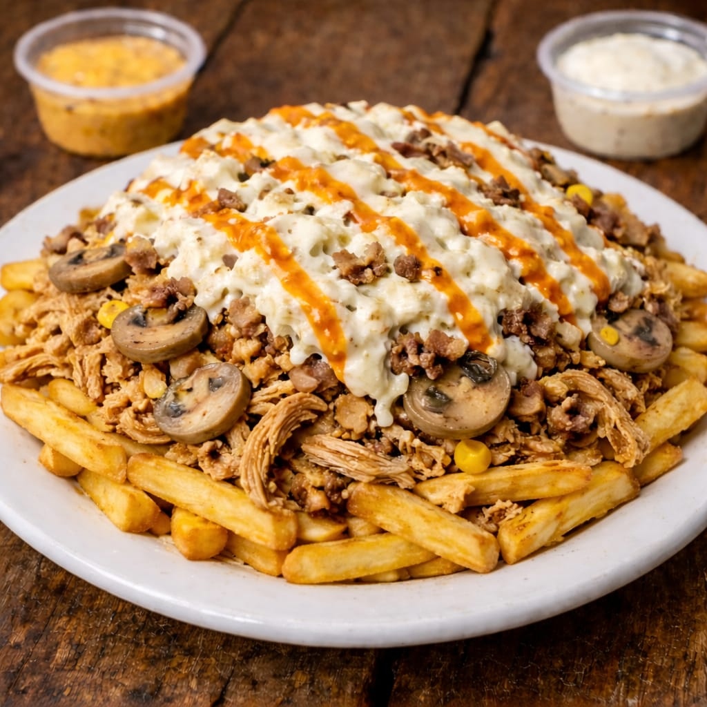 Una delicia irresistible con papa francesa, tierno pollo desmechado, champiñones, abundante queso costeño y el sabor único de la salsa de la casa y salsa de ajo.