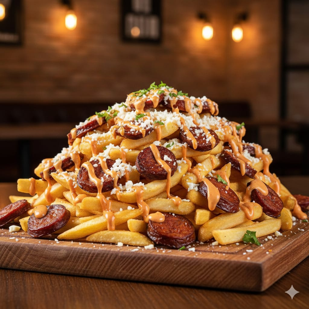 Triple impacto de sabor: papa francesa con salchicha americana, pollo desmechado, carne desmechada y chorizo, bañado en queso costeño, salsa de la casa y salsa de ajo.