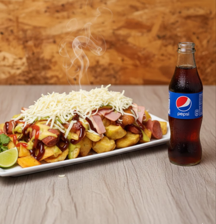 Papa francesa, salchicha tradicional, maduro, costillitas trocitos 100 g, tocineta, chorizo, ripio de papa, queso mozzarella y salsas de la casa(salsa de queso, tártara y BBQ) y gaseosa 1 L Postobón.