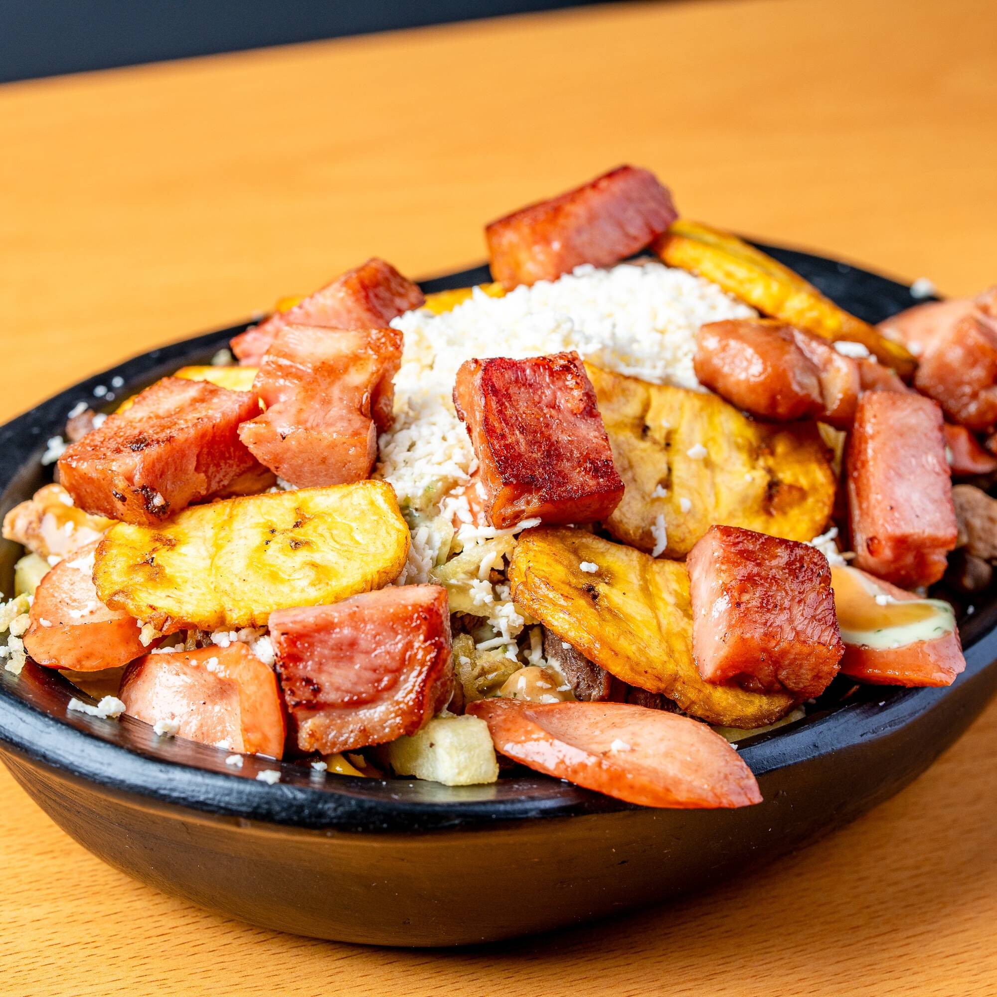 Papa francesa, carne y pollo salteado, costilla de cerdo ahumada, maduro, guayabo frito, maíz tierno, salchicha, papa cabello de ángel, salsas de la casa y queso costeño.