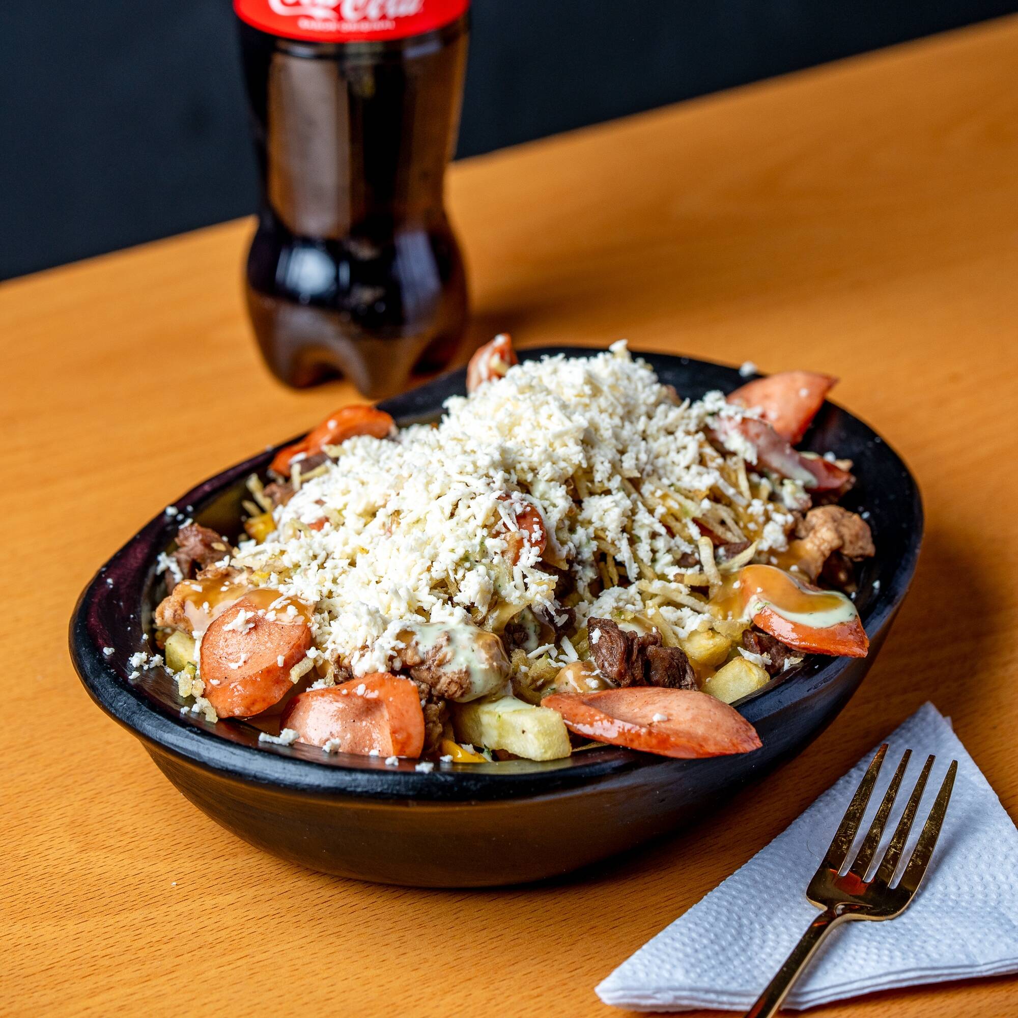 Papa francesa, carne salteada, maíz tierno, salchicha, papa cabello de ángel, salsas de la casa y queso costeño.
