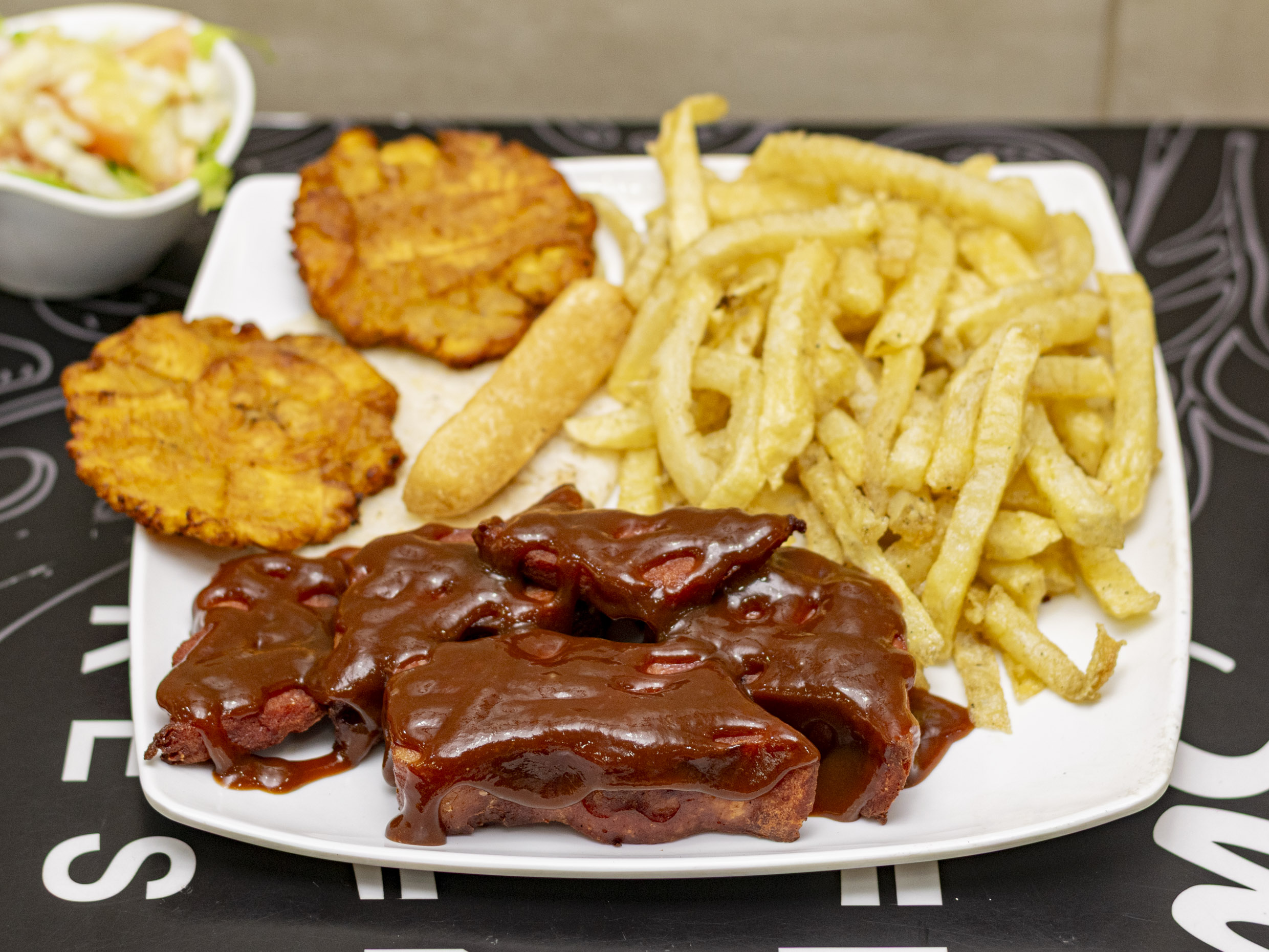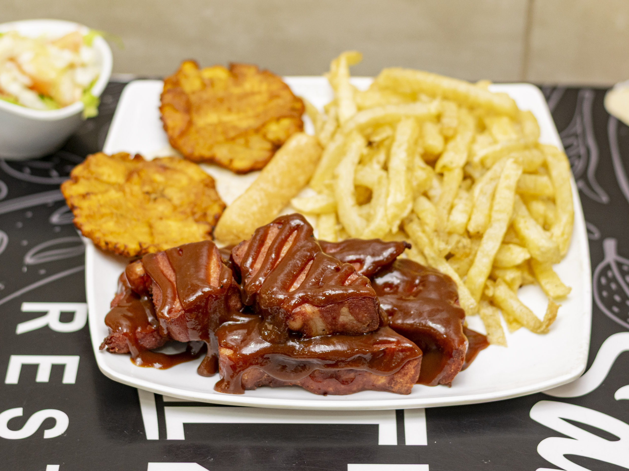 350 g De Costillitas BBQ, acompañadas de Ensalada de sal o de dulce, papa a la francesa o criolla, Patacon, yuca & Arepa