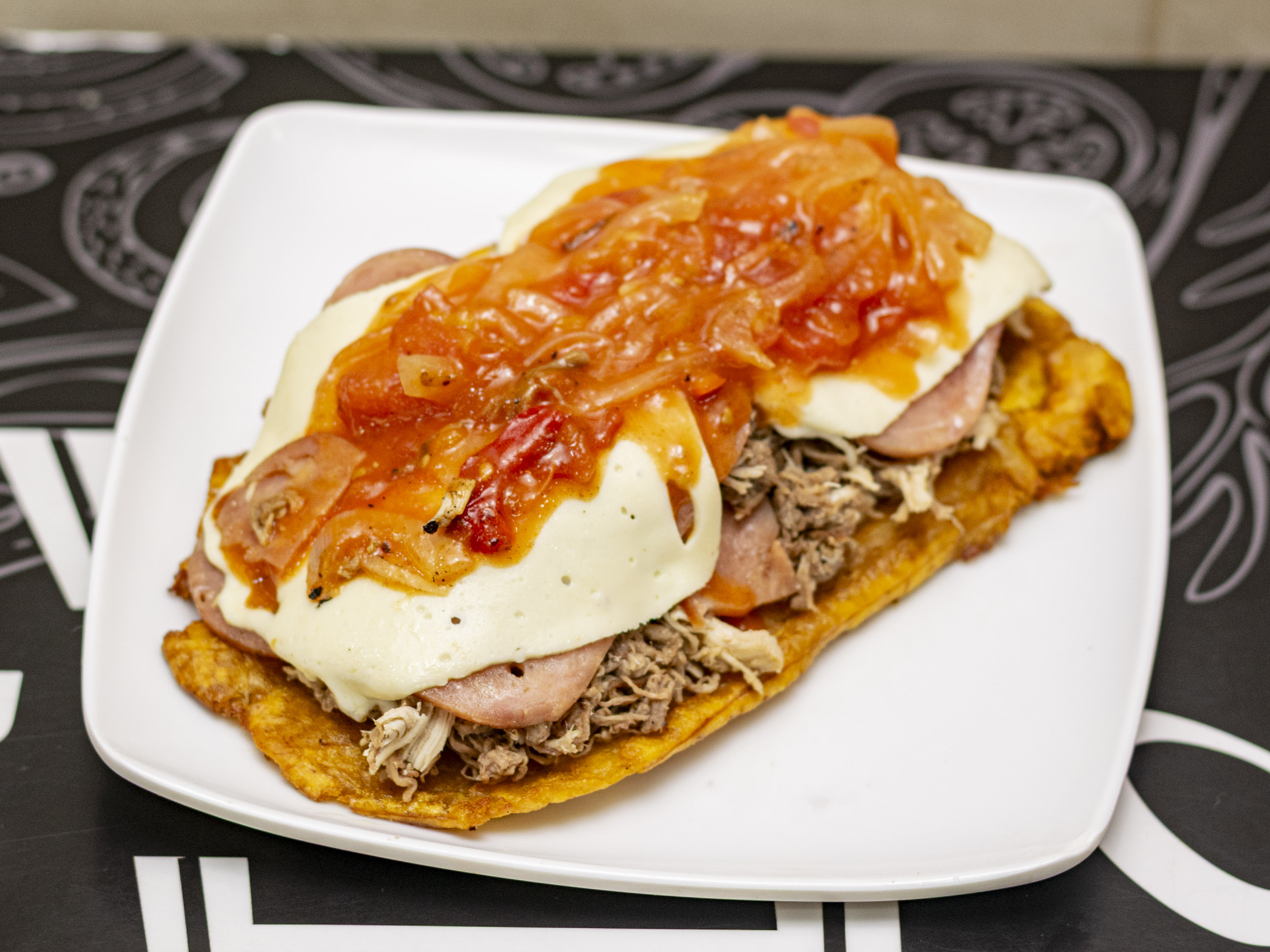 Patacon frito, con pollo desmechado, carne desmechada, jamon, Queso gratinado & salsa de la casa