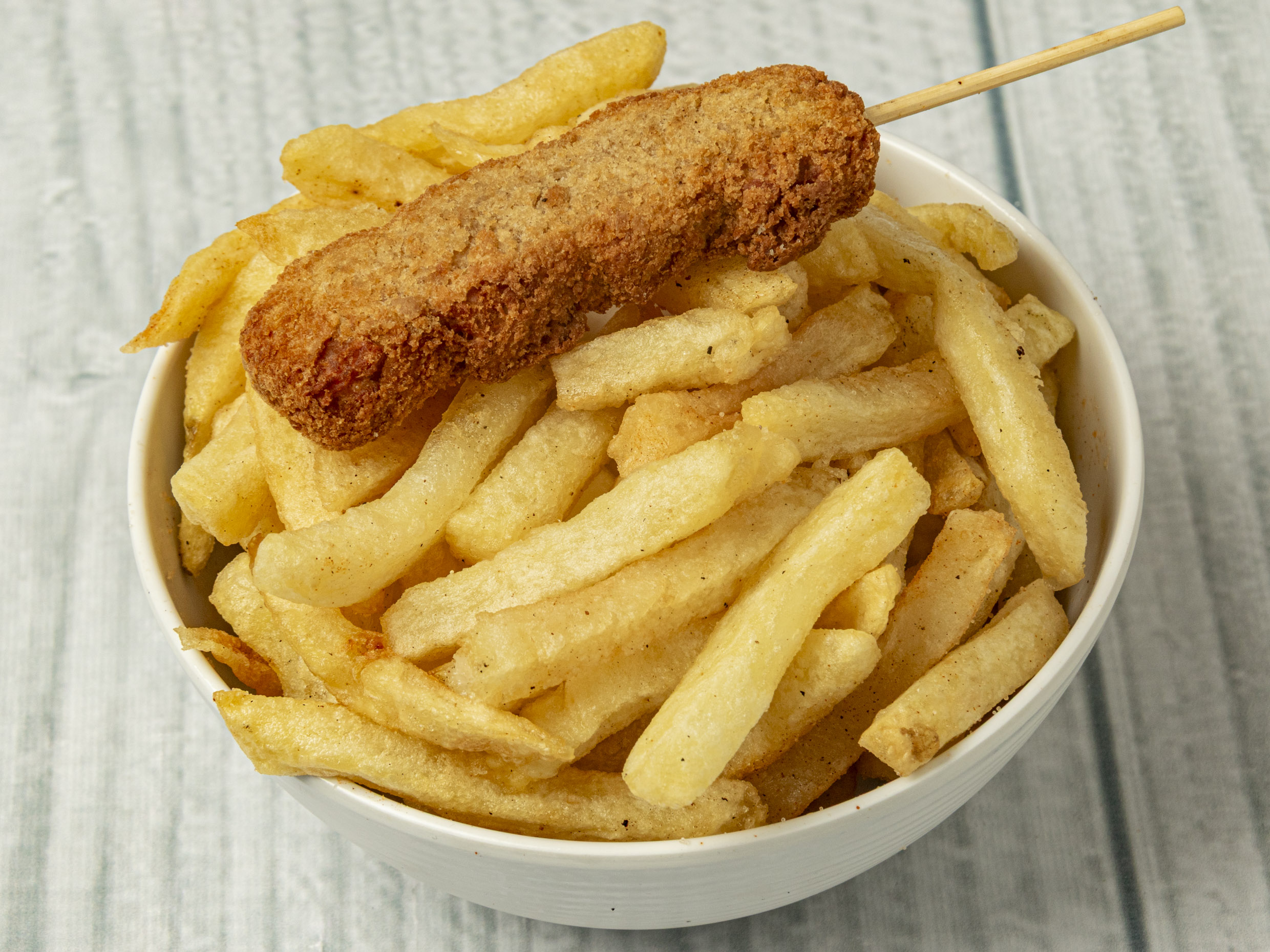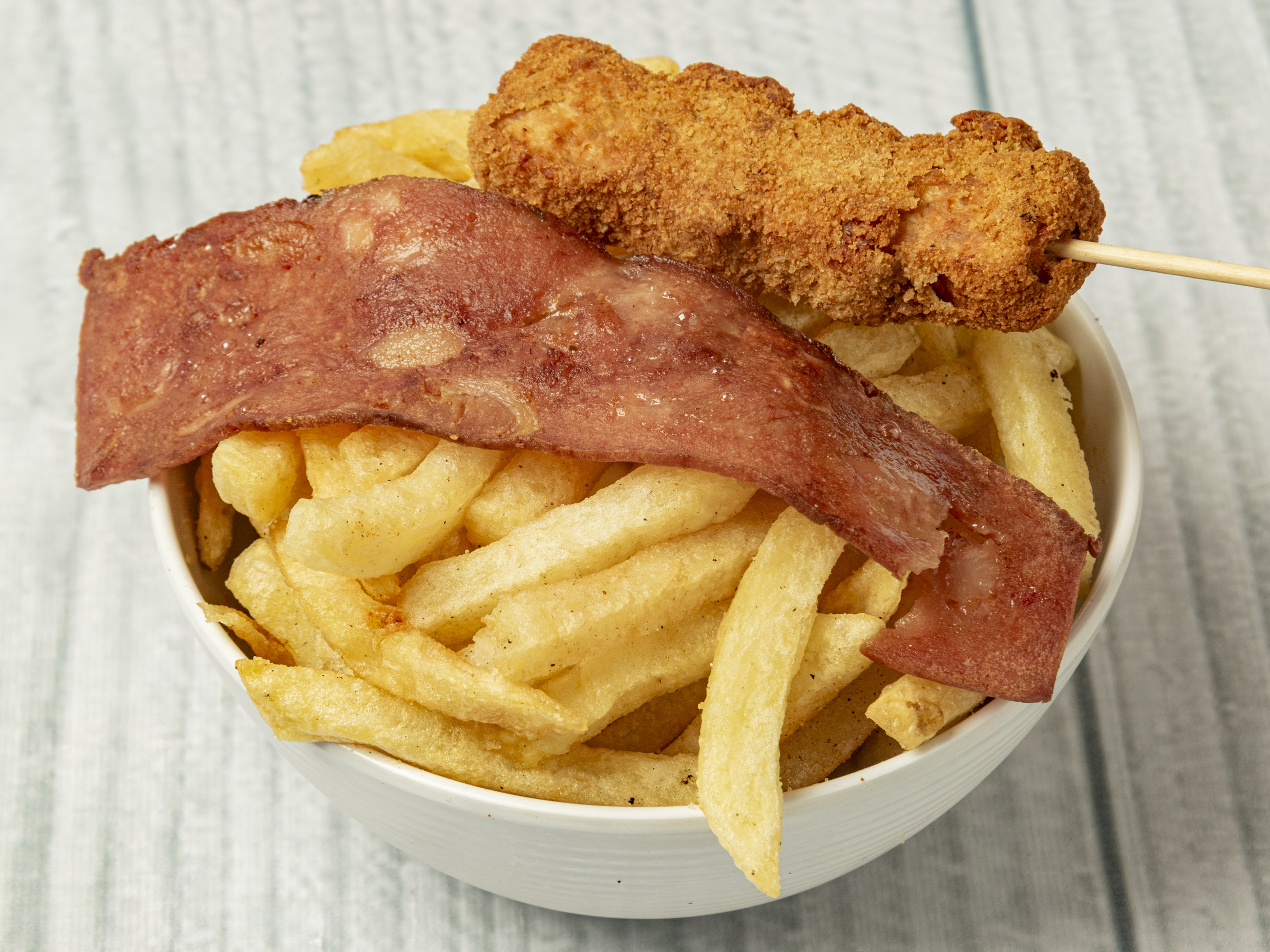 Salchipapa Papito, Papa a la francesa, 1 pincho de pollo apanado & Tocineta
