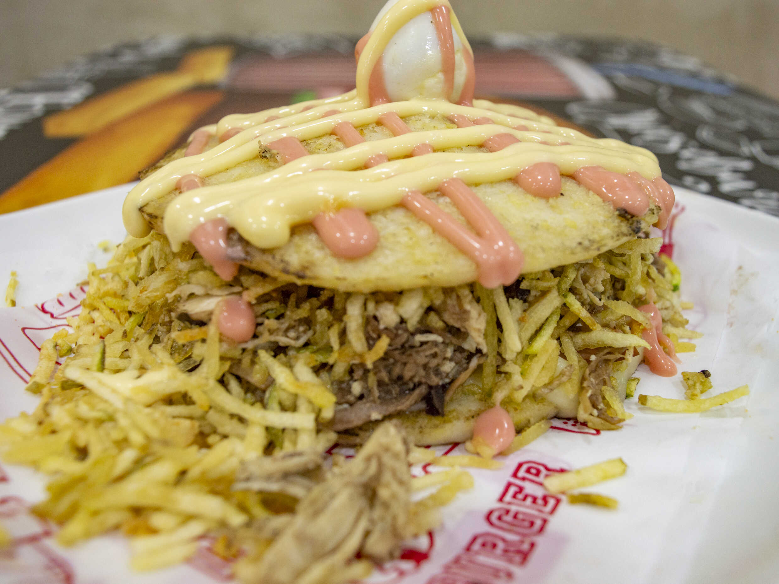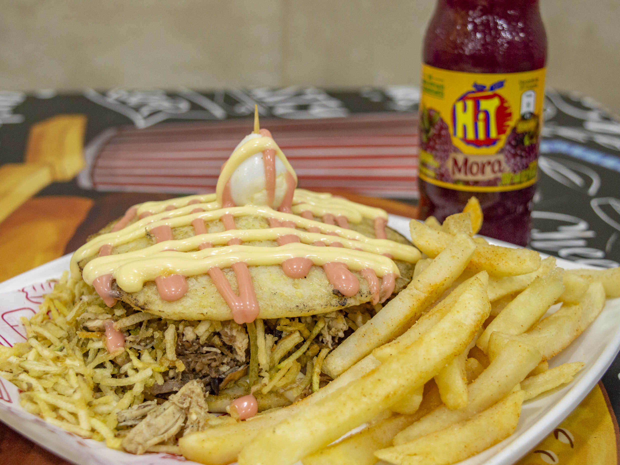 Arepa Rellena Ranchera, Carne desmechada, Jamon, Queso, Maiz tierno, Tocineta, Champiñones, papas en fosforo & Huevo de codorniz