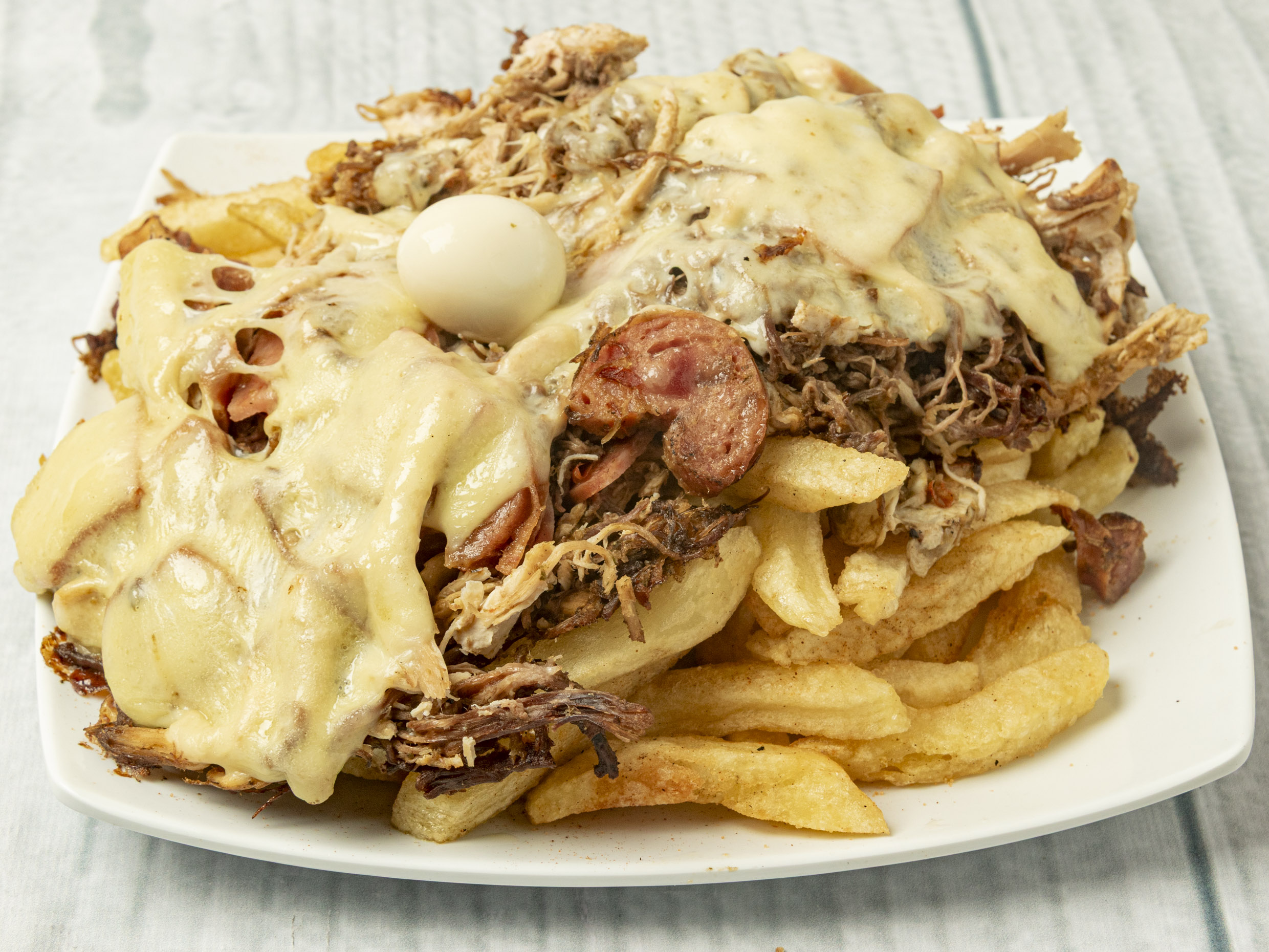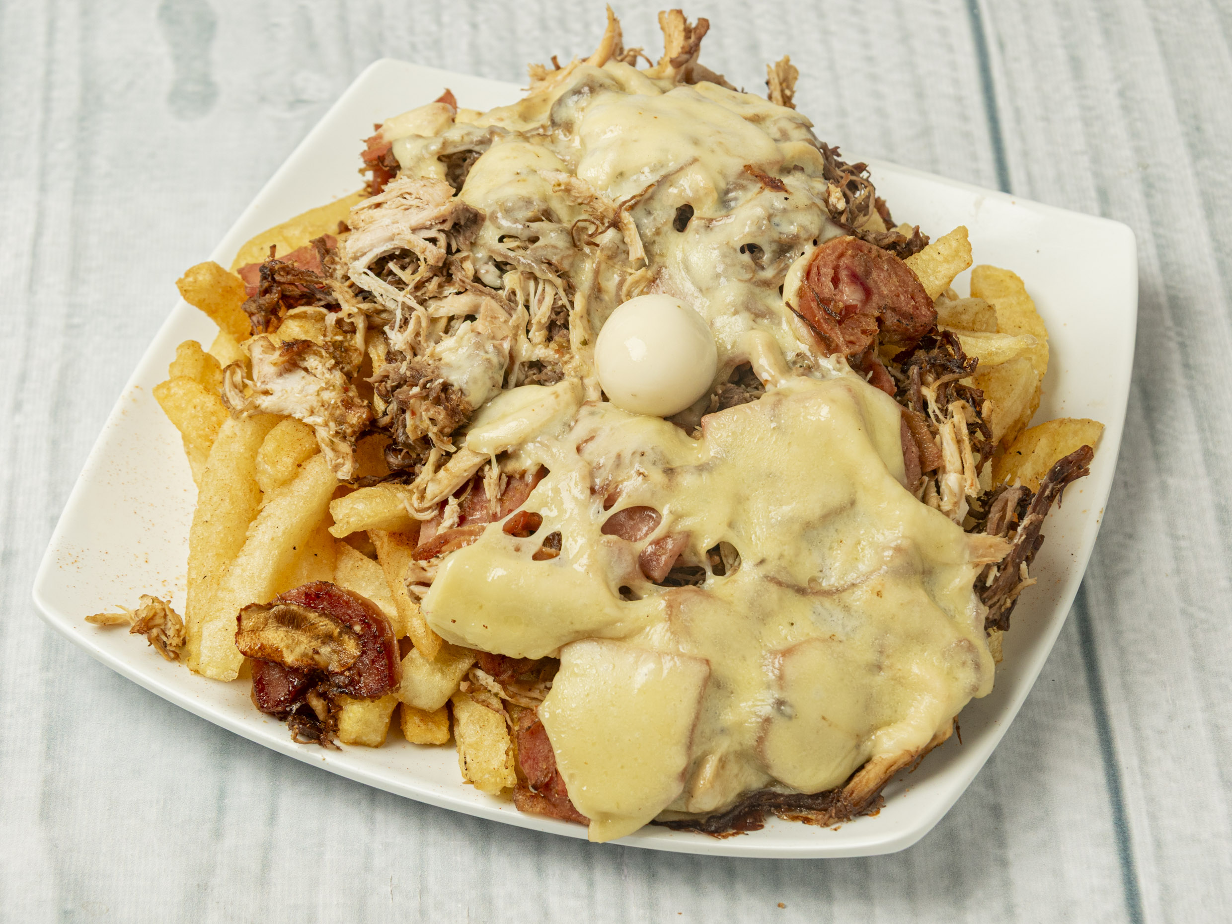 Salchipapa Especial Mexicano, 250gr Papa a la francesa & Salchicha suiza, Carne desmechada, Aguacate, Nachos 100gr de costilla de cerdo & 100gr de alas