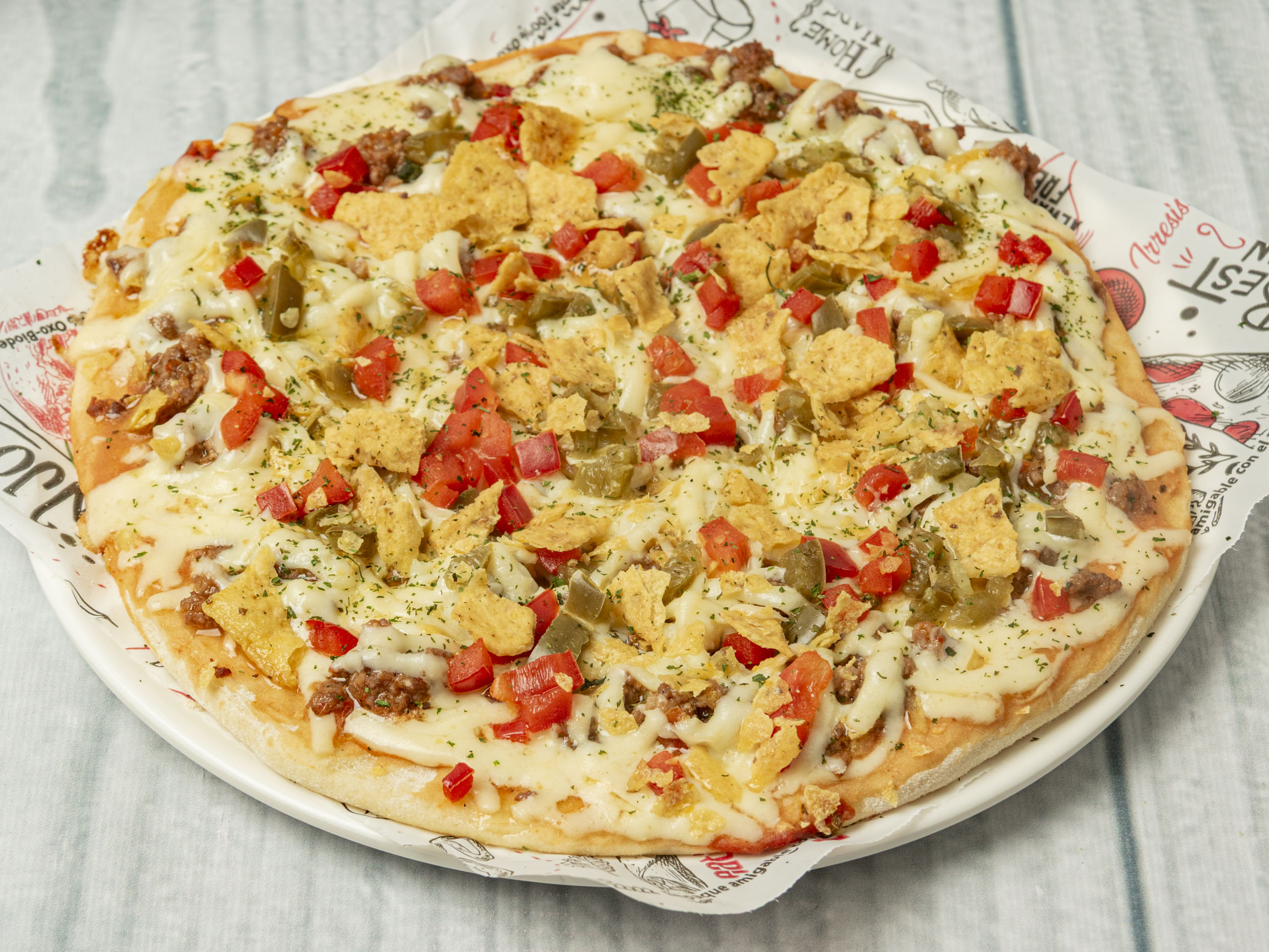 Pizza Mexicana de 22 cm (4 rebanadas): nachos, queso, pimentón, carne molida, jalapeños y perejil.