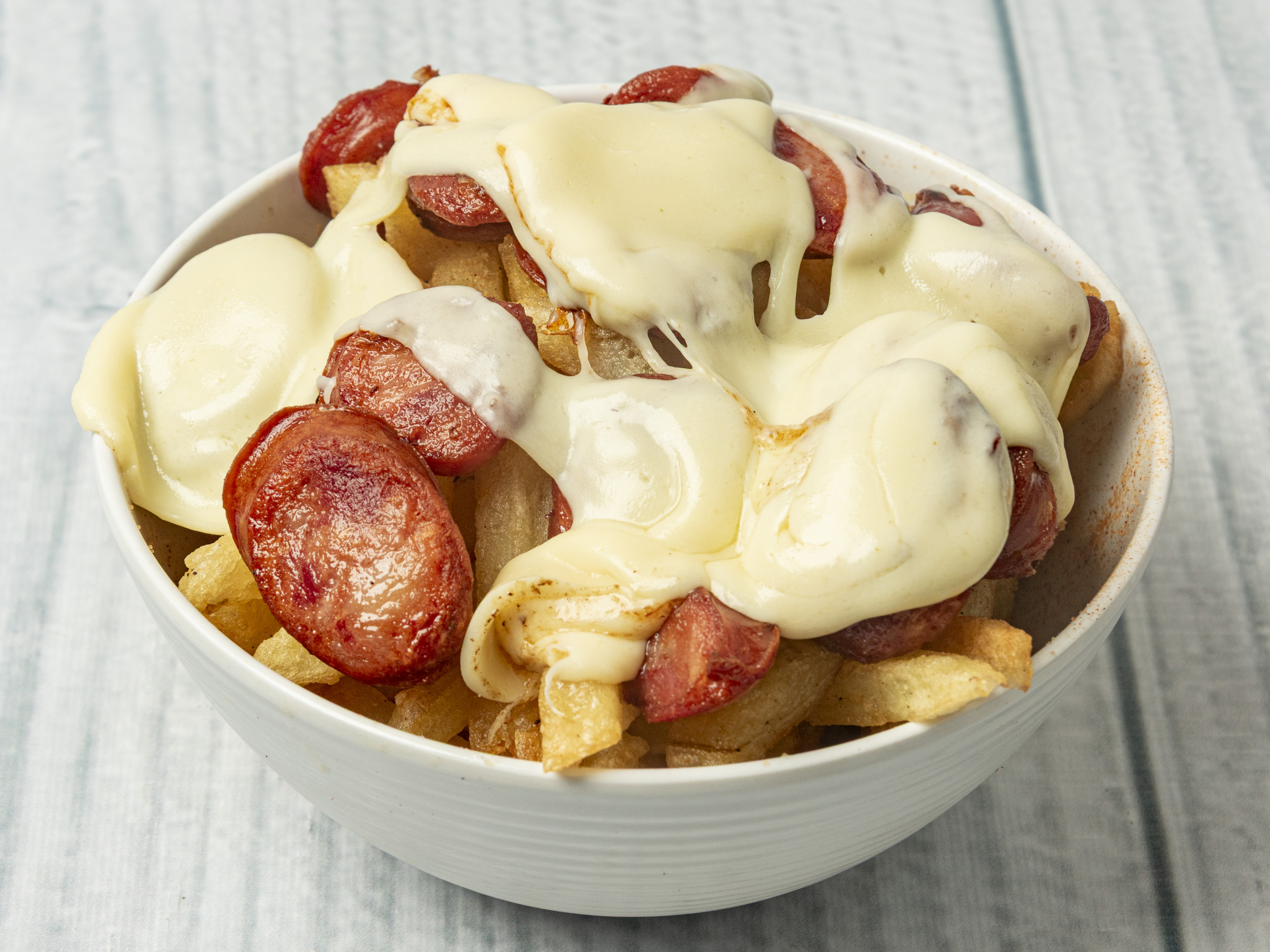 Salchipapa Suizo, 250gr Papa a la francesa, salchicha suiza & queso gratinado