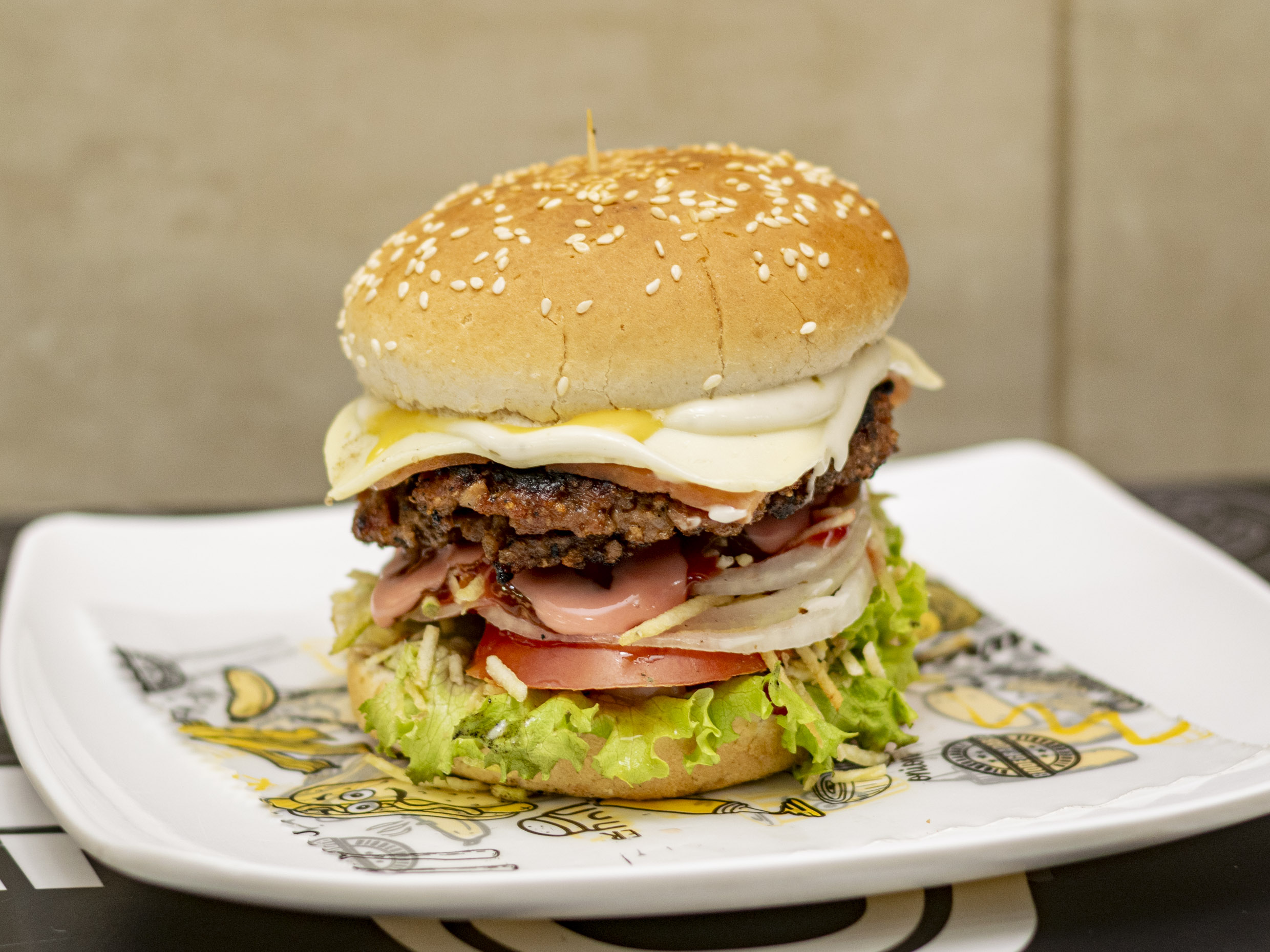 Hamburguesa Artesanal Super, 200 GR de Carne 100% de Res, Tocineta, Huevo frito, Champiñones, Queso, Cebolla, Tomate, Lechuga fresca & Salsas a elección