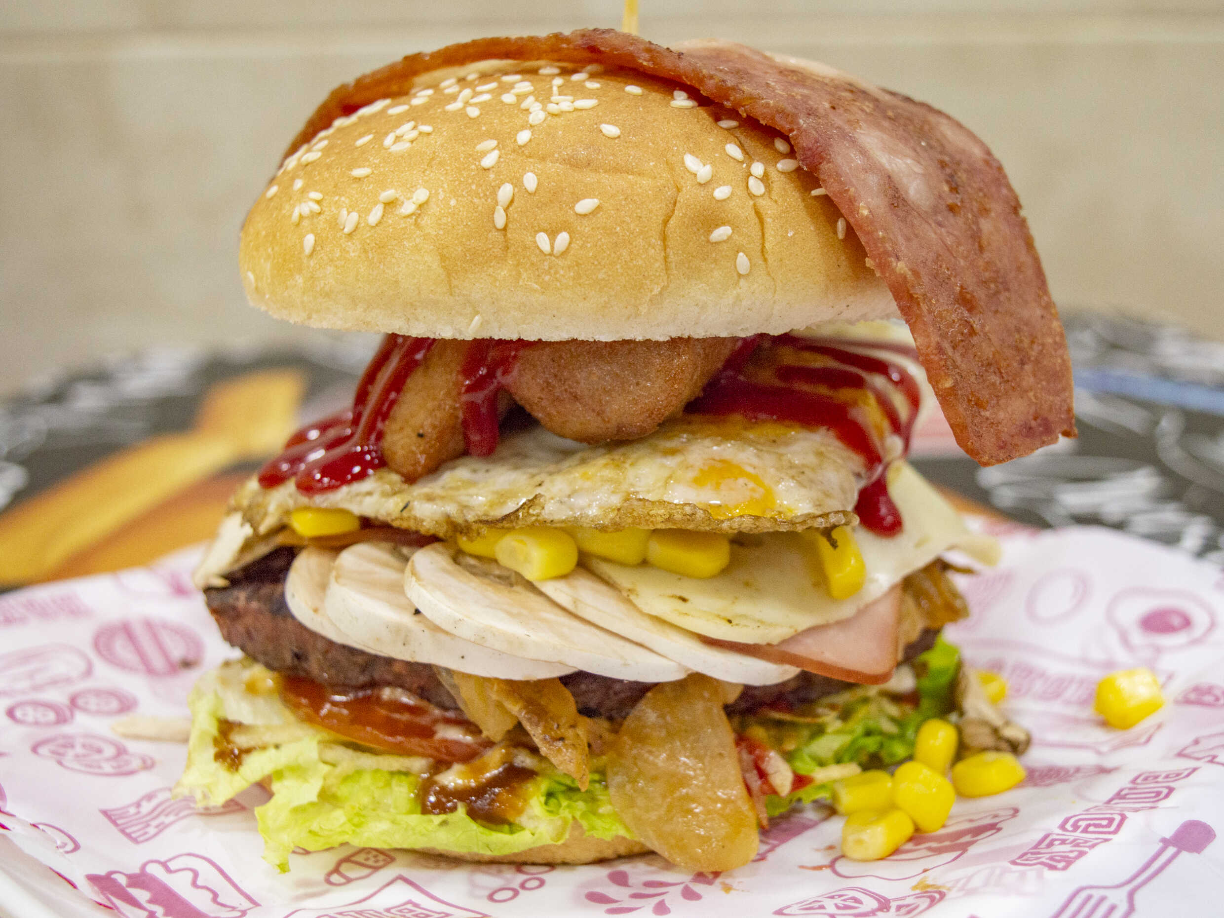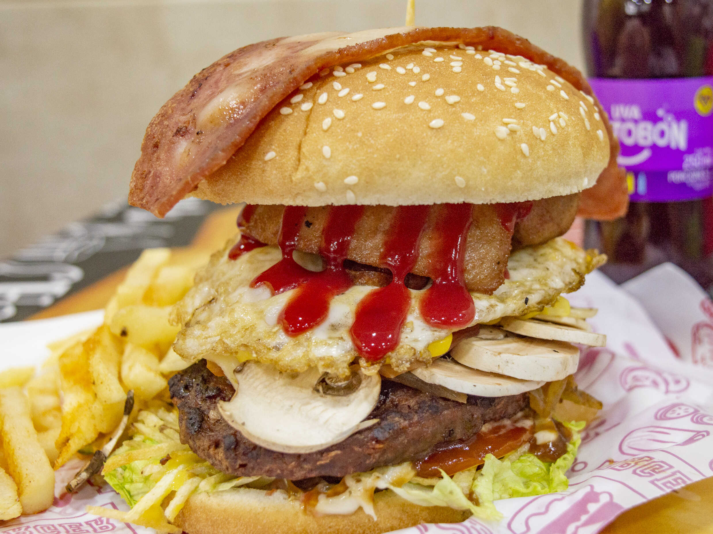 Hamburguesa Mega Super De Carne, 150 gramos de Carne, Jamon, Queso, Cebolla, Tomate, Lechuga fresca, Huevos de codorniz, Champiñones,Maiz tierno, Tocineta, papas en fosforo & Salsas