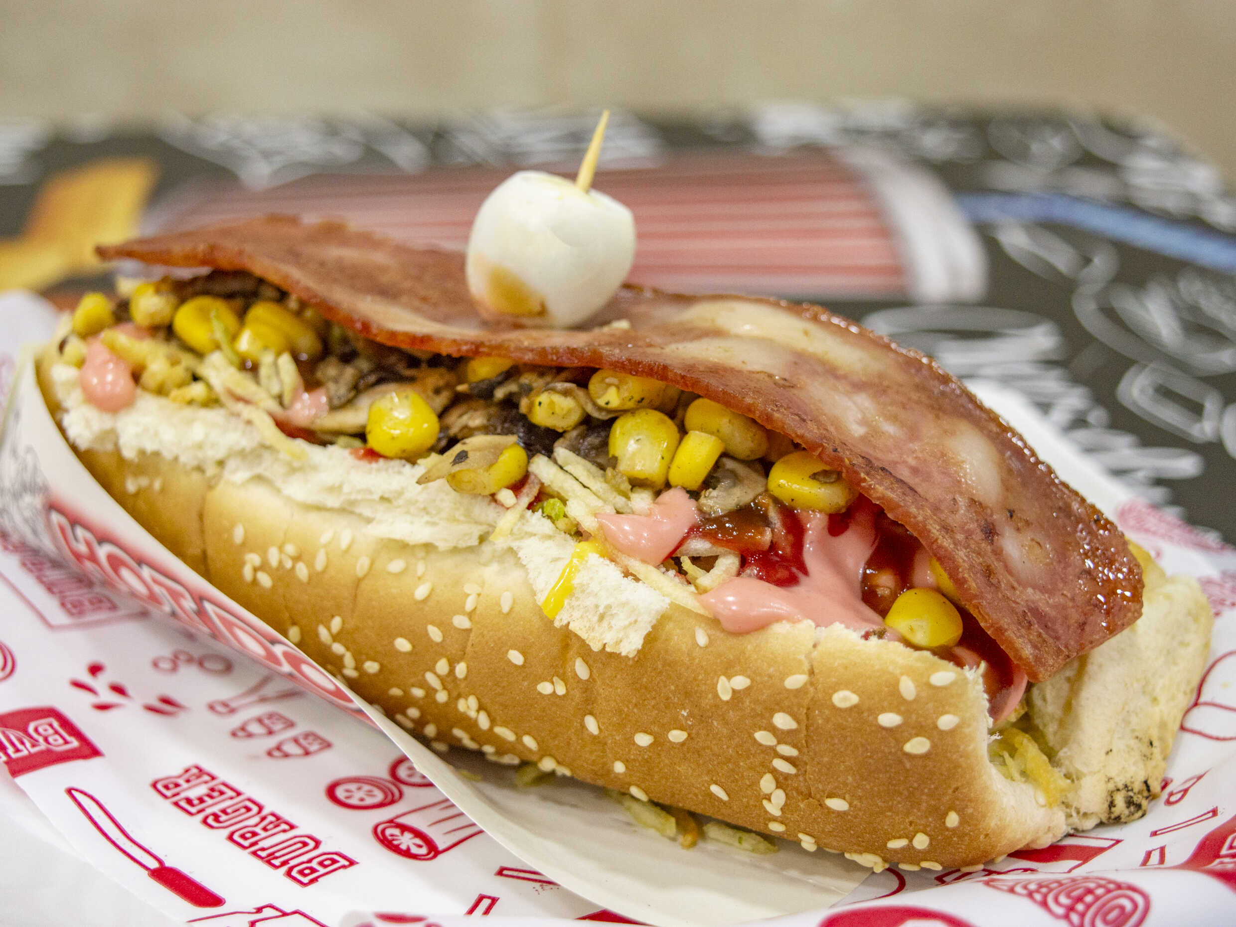 Perro Megasuper, Salchicha americana, Pollo desmechado, Tocineta, Maiz tierno, Jamon, huevos de codorniz (2), Doble Queso, Papas en fosforo & Salsas (mostaza, tomate, rosada, bbq)