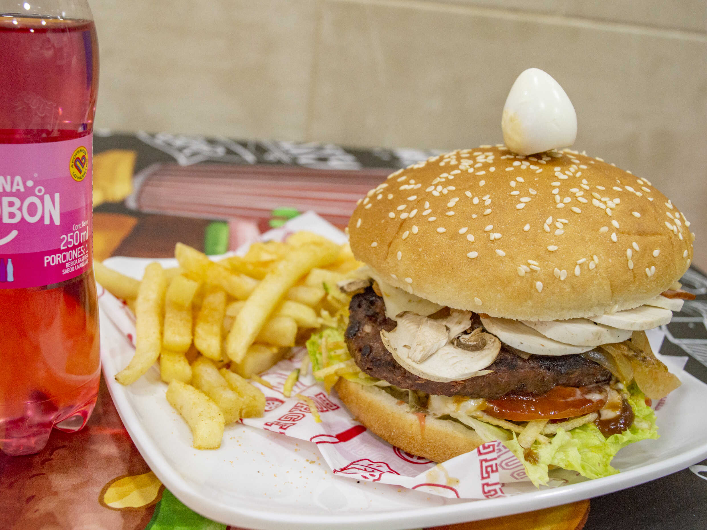 Hamburguesa Super De Pollo, 150 gramos de Pollo, Jamon, Queso, Cebolla, Tomate, Lechuga fresca, Huevos de codorniz, Champiñones, papas en fosforo & Salsas.