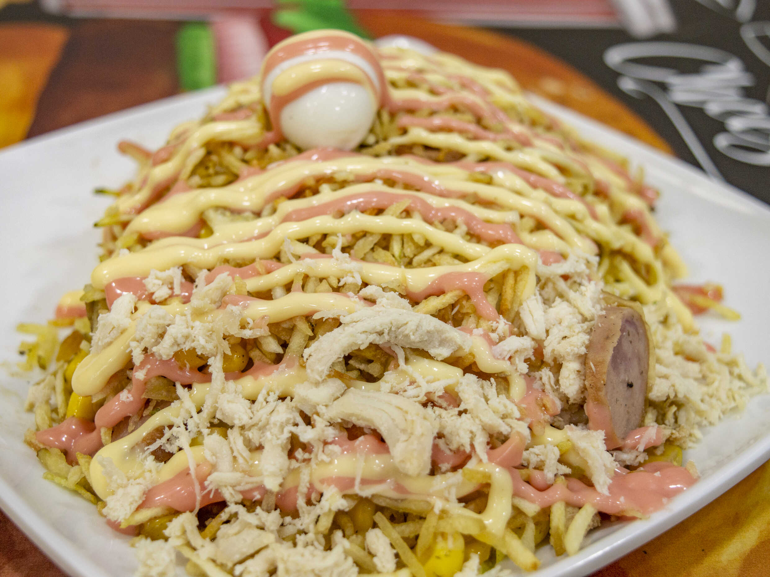 Salchipapa Especial Mixta, 150gr Papa a la francesa & Salchicha suiza, Pollo y Carne desmechado Champiñones, Jamón, Queso & huevos de codorniz