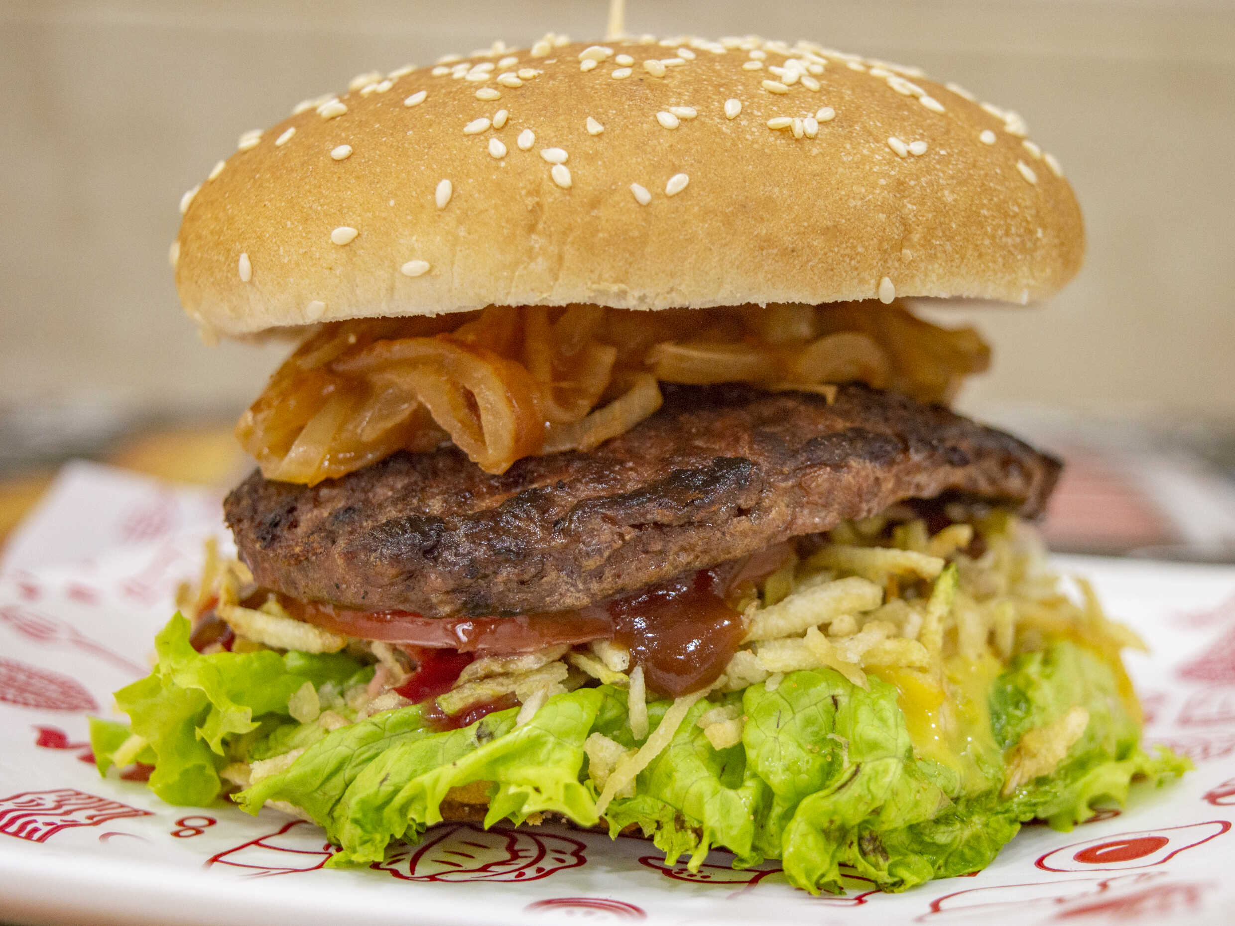 Hamburguesa Ropa Vieja De Carne, Con Carne desmechado, Jamon, Queso, Cebolla, Tomate, Lechuga fresca, papas en fosforo & Salsas a elección