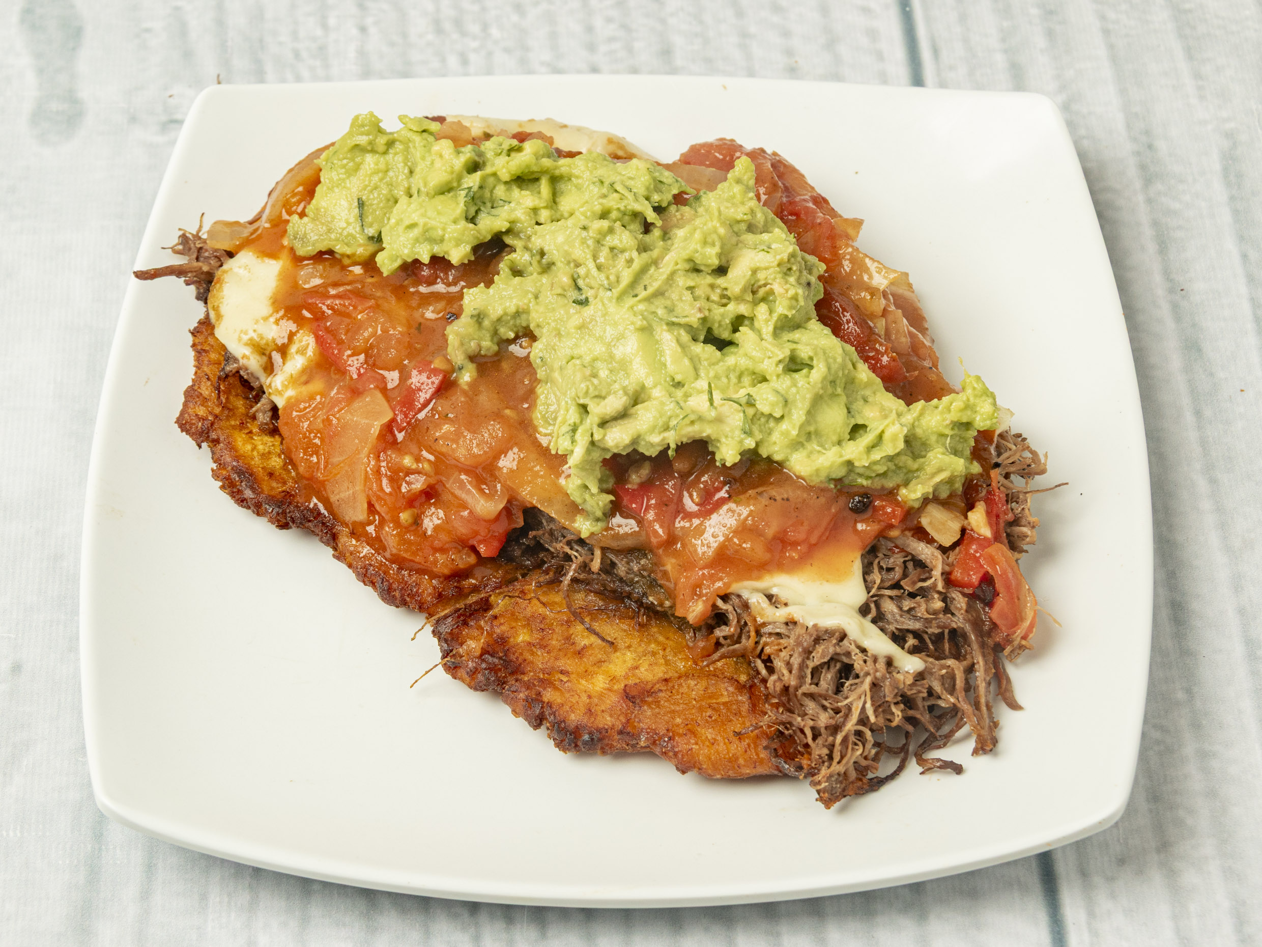 Patacon Criollo, Patacon frito, carne desmechada, Pico de gallo, Aguacate, Queso fundido & salsa de la casa