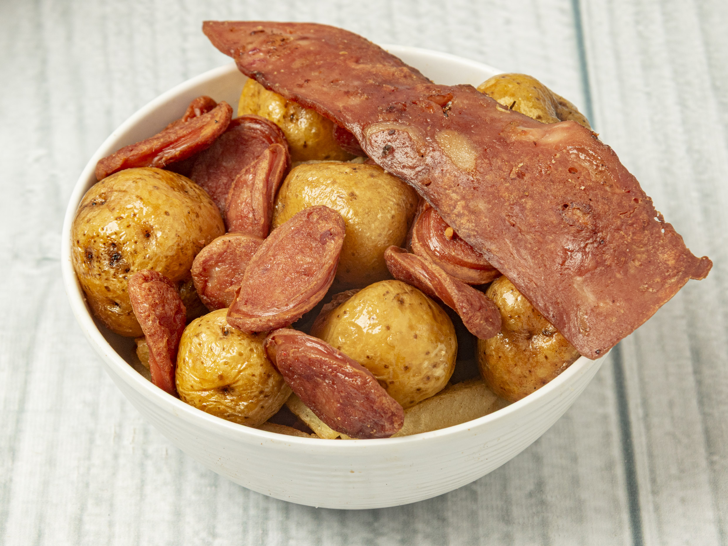 Salchipapa Criollo, 250gr Papa Criolla, Salchicha Americana & Tocineta