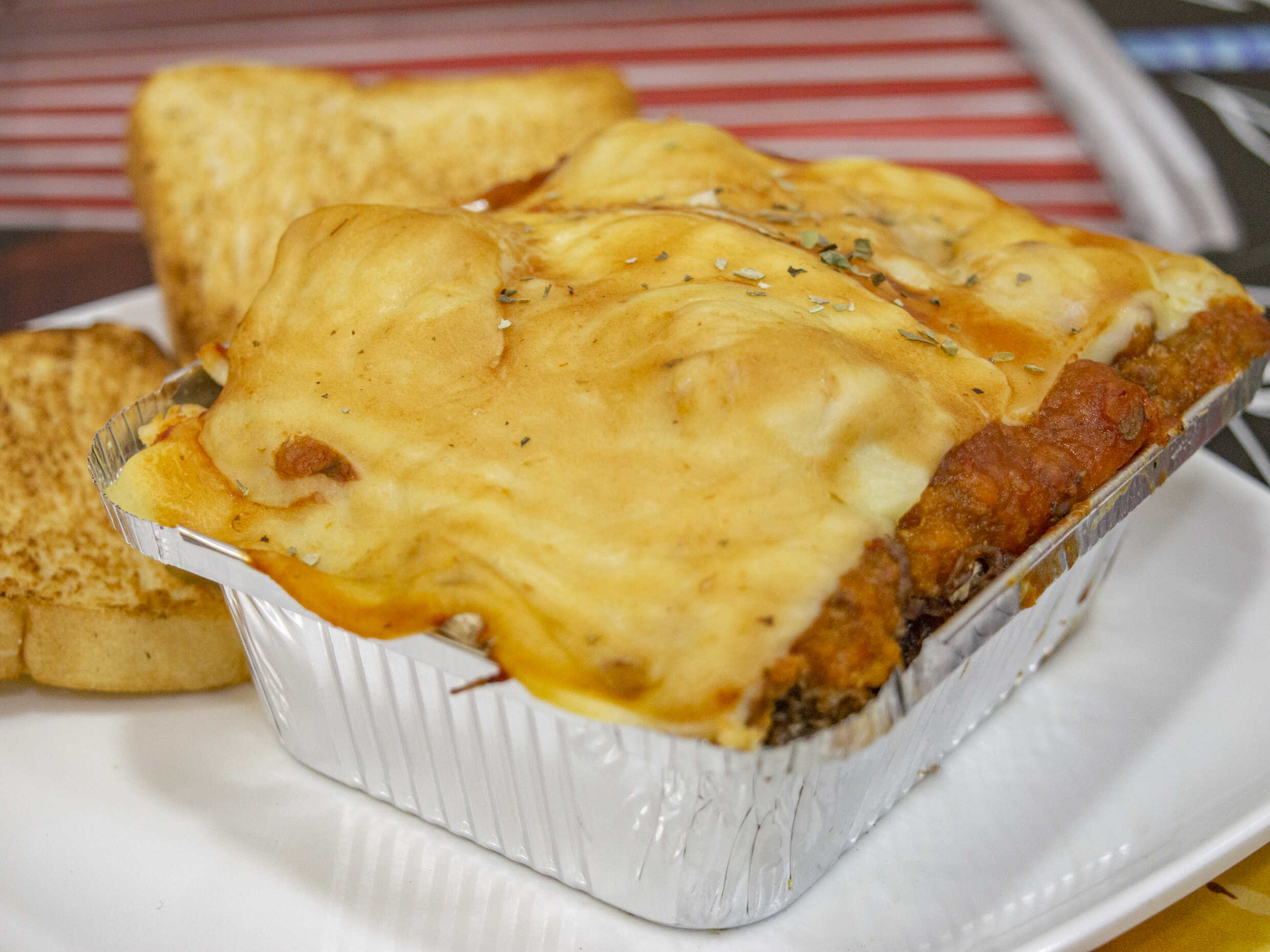 Lasagña De Carne, Carne boloñesa, Champiñones, Carne desmechada, Jamon, Queso, Pasta lasaña, Salsa bechamel, Acompañada de pan tajado