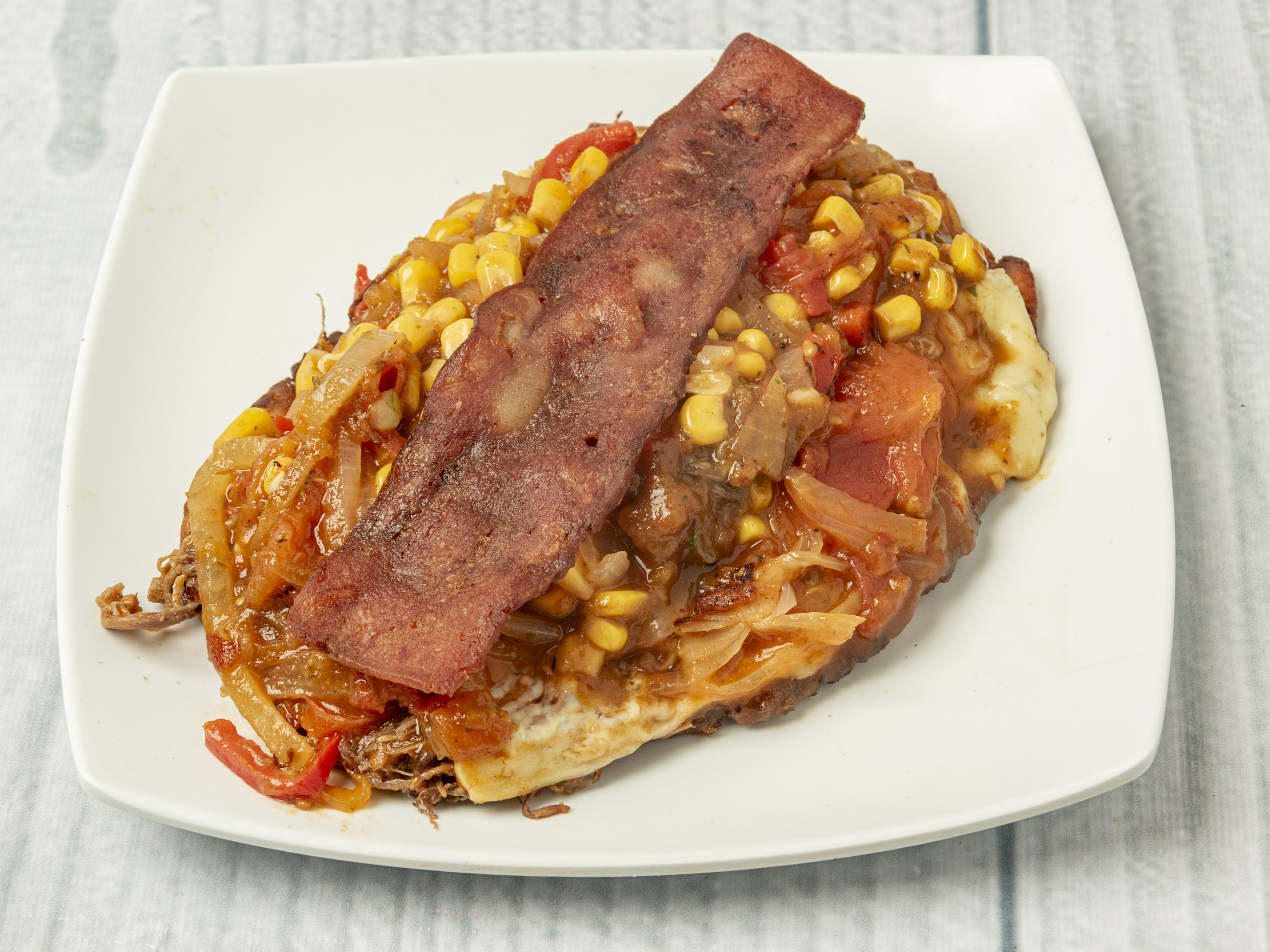 Carne desmechada, maíz, tocineta, queso cheddar y queso mozzarella.