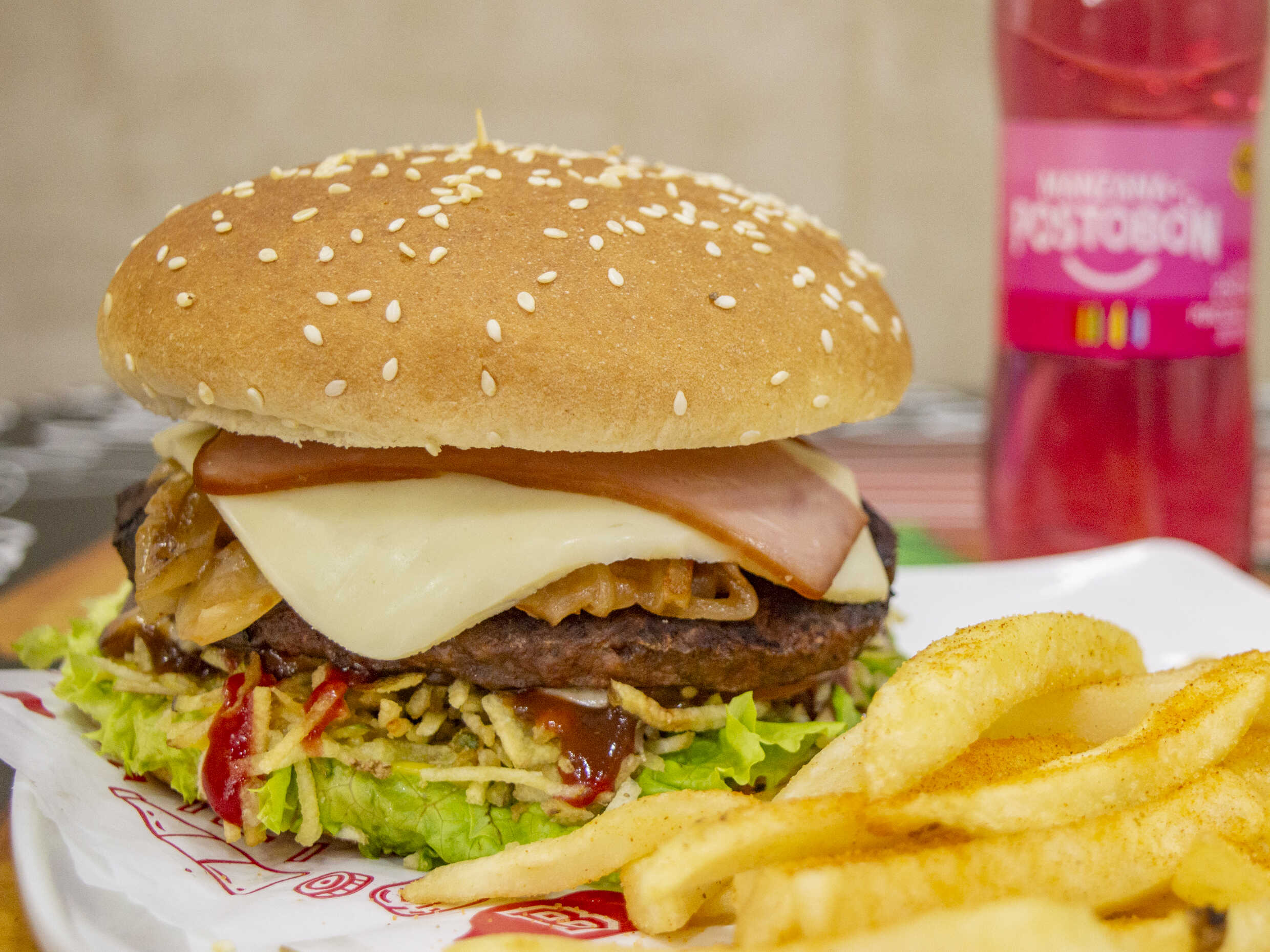 Hamburguesa Especial De Carne, 150 gramos de Carne, Jamon, Queso, Cebolla, Tomate, Lechuga fresca, papas en fosforo & Salsas