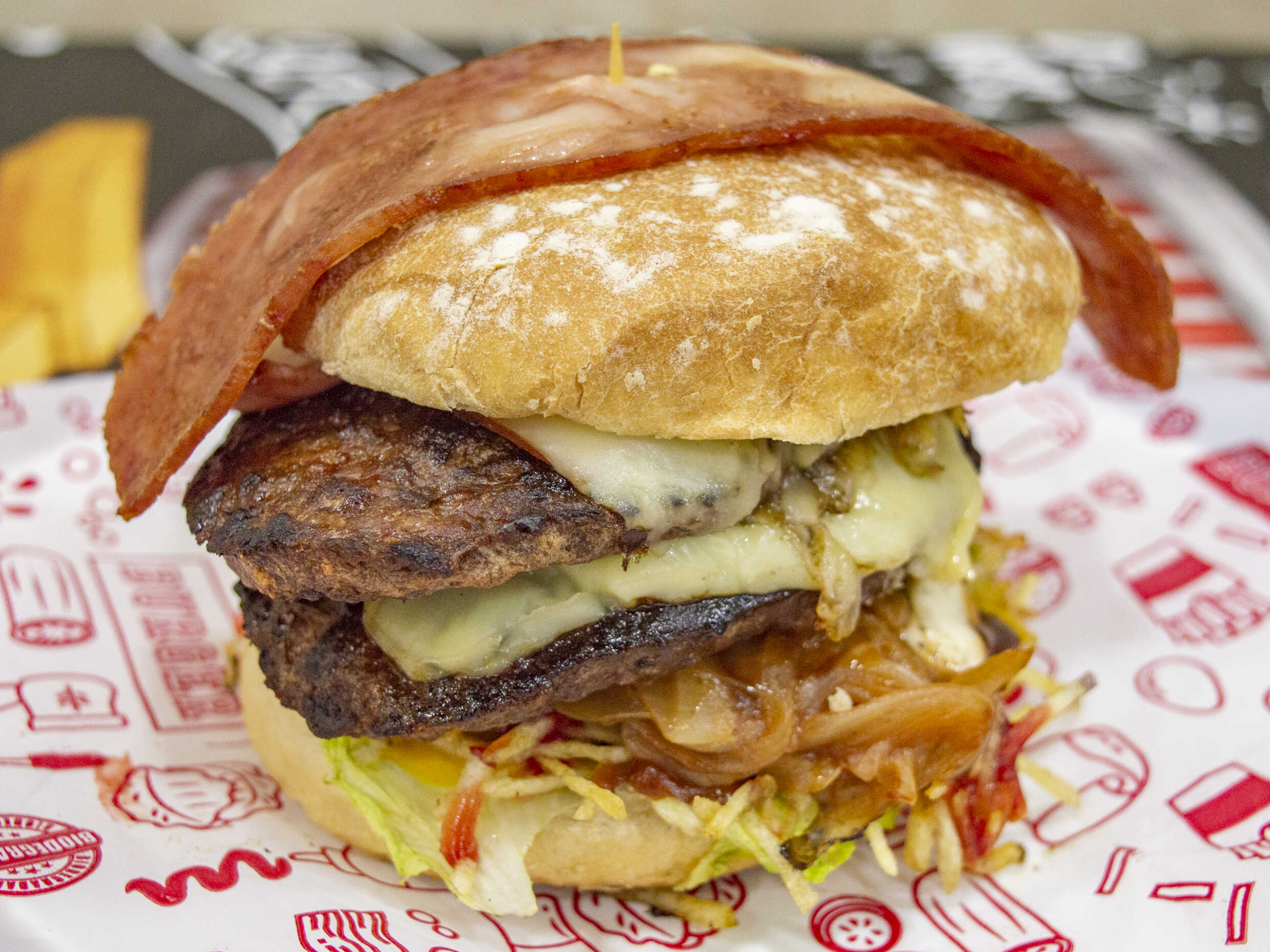 Hamburguesa Artesanal TRIPLE CARNE, Triple carne 100% de Res, Tocineta, Queso cheddar, Cebolla, Tomate, Lechuga fresca & Salsas