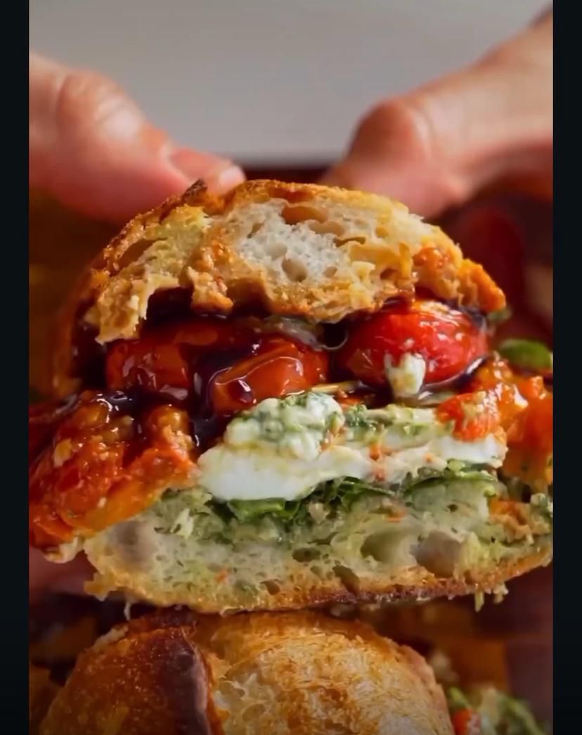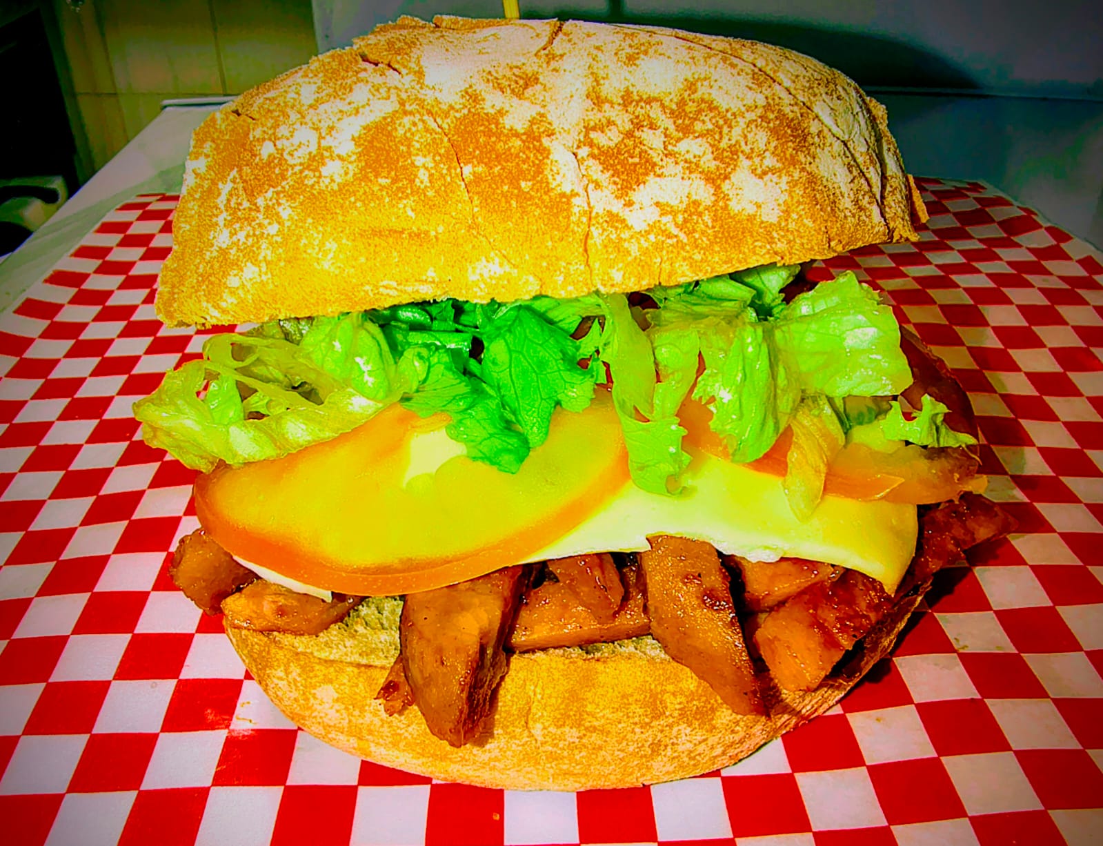 2 Tajadas de jamón de pavo, 1 tajada de pernil de cerdo, dos tajadas de queso mozzarella, vegetales como tomate, cebolla caramelizada y lechuga más pan artesanal de masa madre.