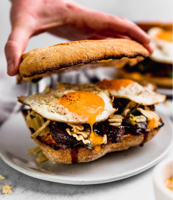 2 Huevos fritos o revueltos, 1 tajada de jamón de cerdo ahumado, 1 tajada de queso tipo mozzarella, pan artesanal con vegetales como tomate, lechuga, cebolla caramelizada y papas chips.