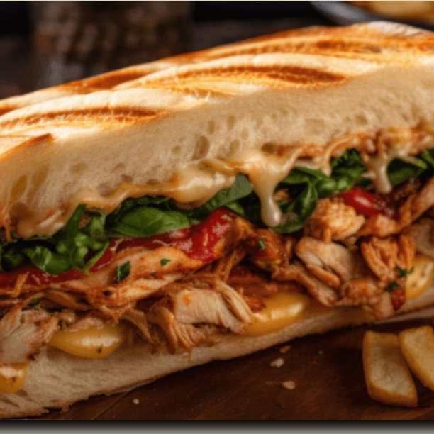 125 g De pechuga desmechada, 75 gramos de tocineta, 1 tajada de pavo, 2 huevos de codorniz, 2 tajadas de queso tipo mozzarella en pan de masa madre, acompañado de vegetales como lechuga, tomate y cebolla caramelizada más papas chips.