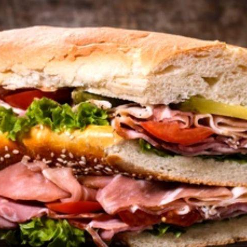 1 Tajada de jamón de cerdo ahumado, 1 tajada de jamón de cordero, 1 tajada de jamón de pavo, 1 tajada de pernil de cerdo, 2 tajadas de queso mozzarella en pan artesanal con vegetales como tomate, cebolla caramelizada y lechuga, acompañado con papas chips.