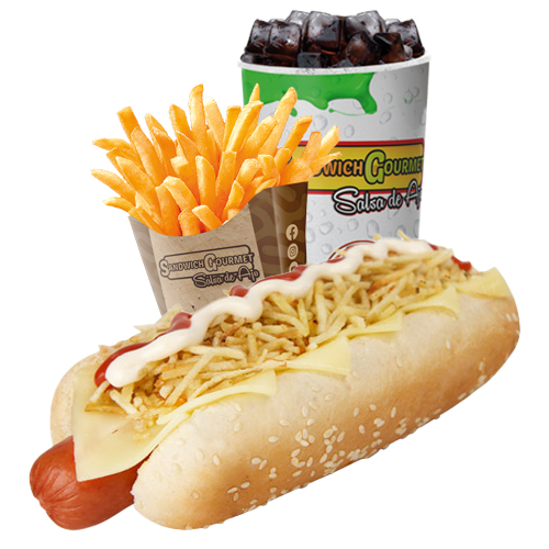 Perro Americano (salchicha de Res, Queso Mozzarella, Papitas Chip Trituradas, Cebolla, Salsa Roja, Salsa Rosada y Salsa de Piña) + Papas 140gr + Pet 400ml.