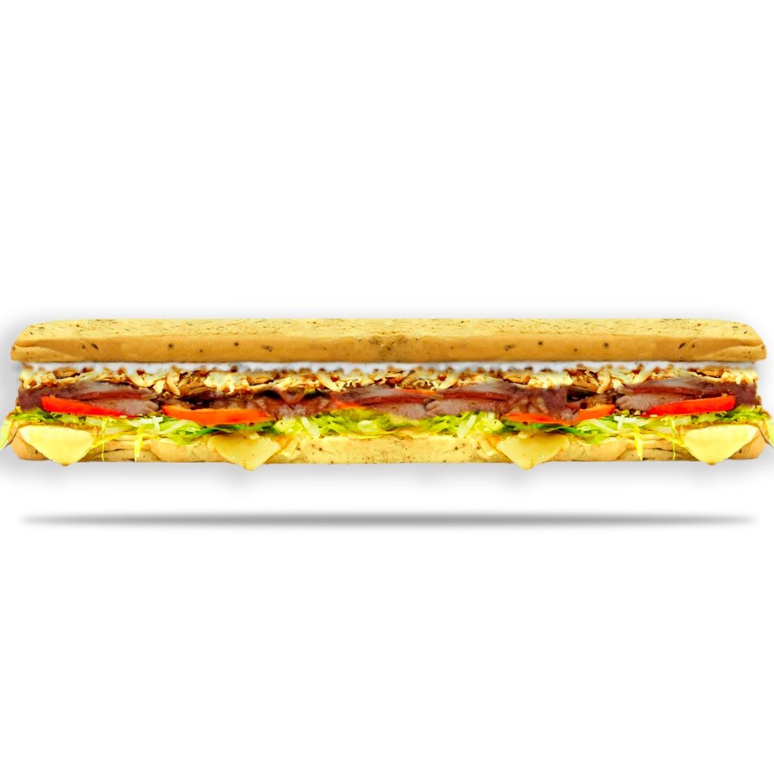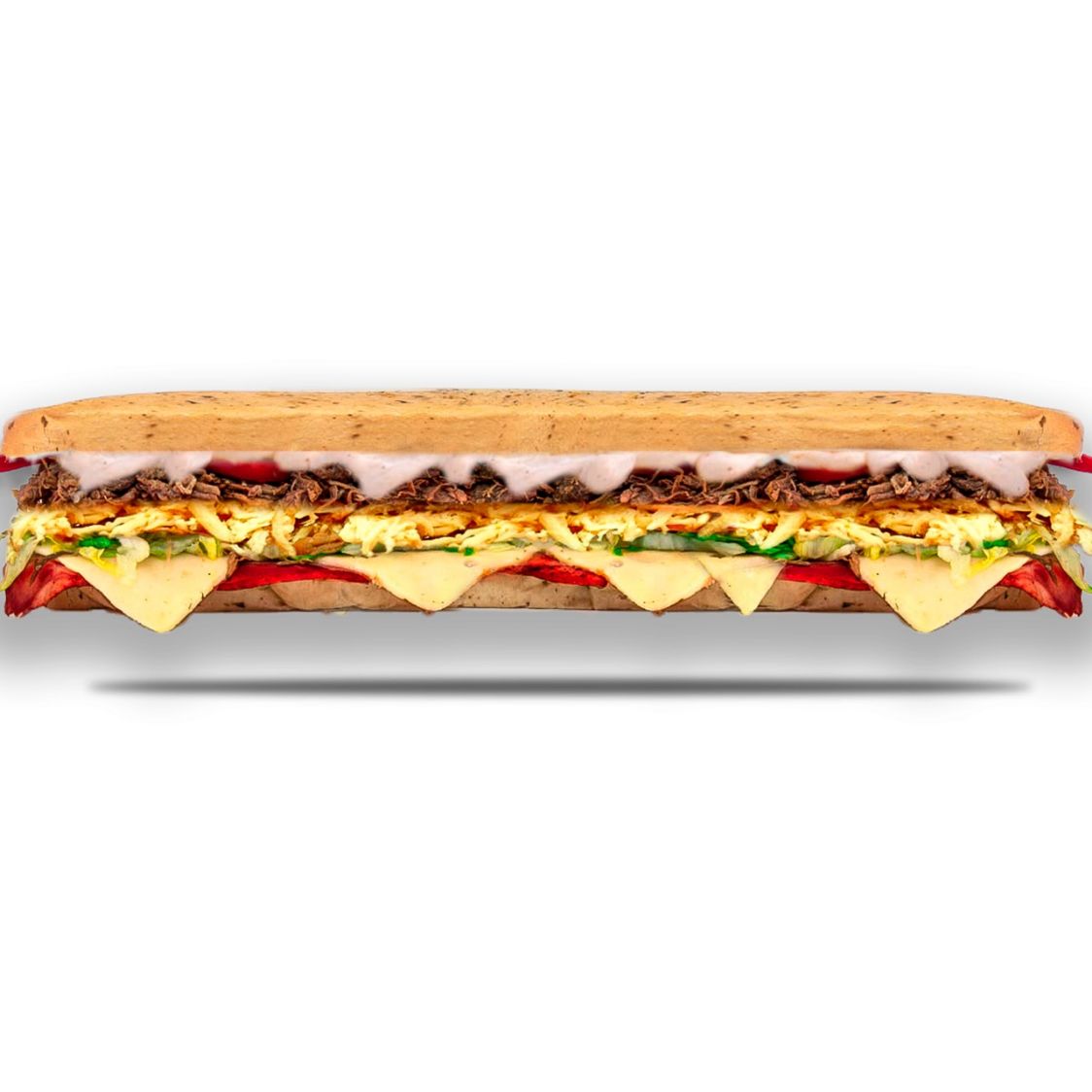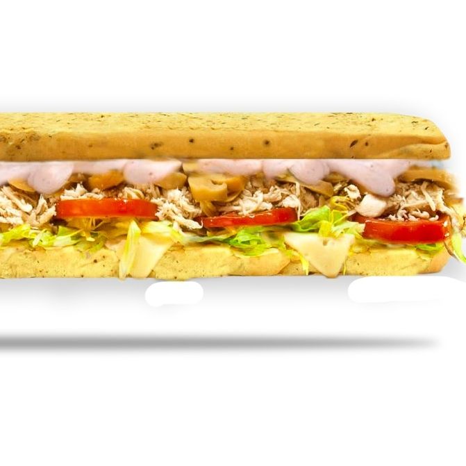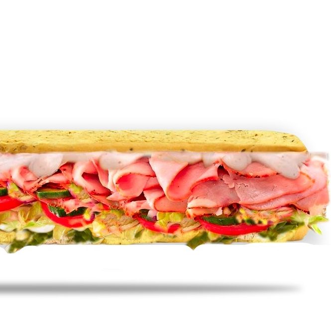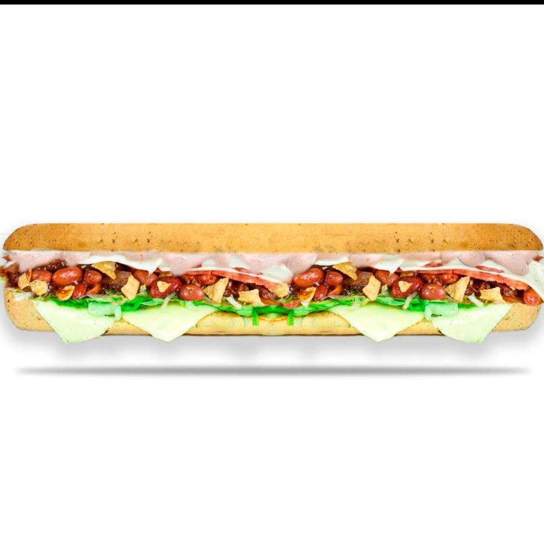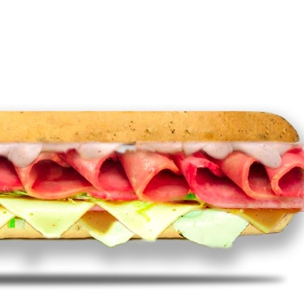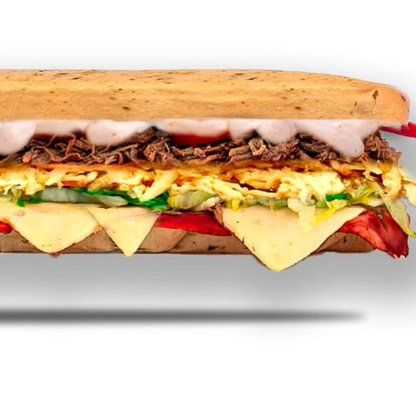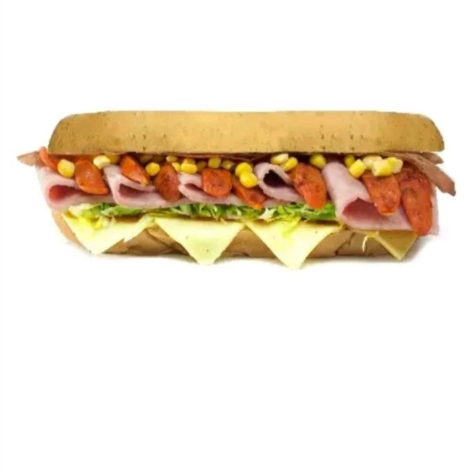 Jamón, salami, pepperoni, lechuga, tomate, queso mozzarella, pimienta, salsa de ajo.