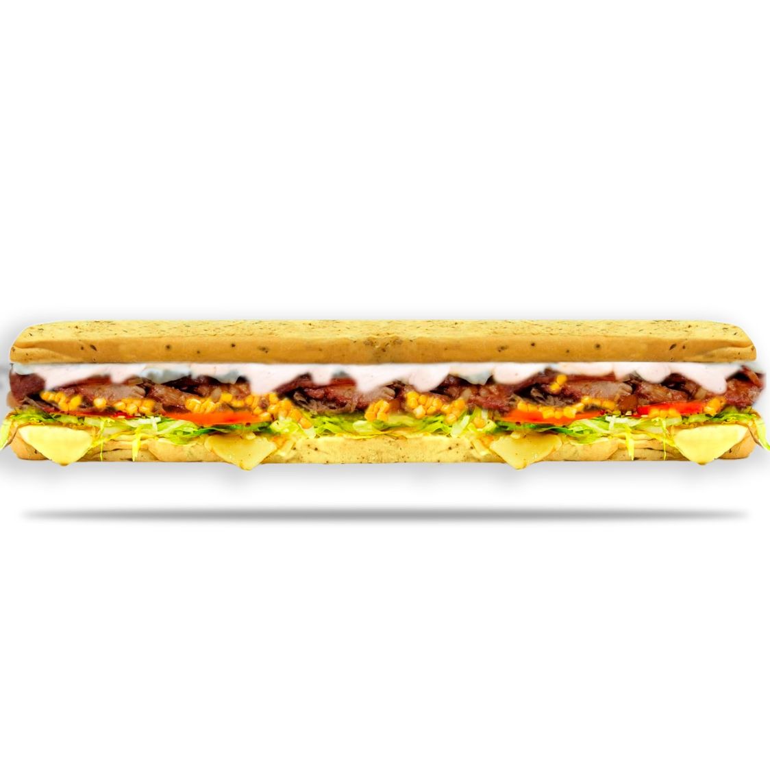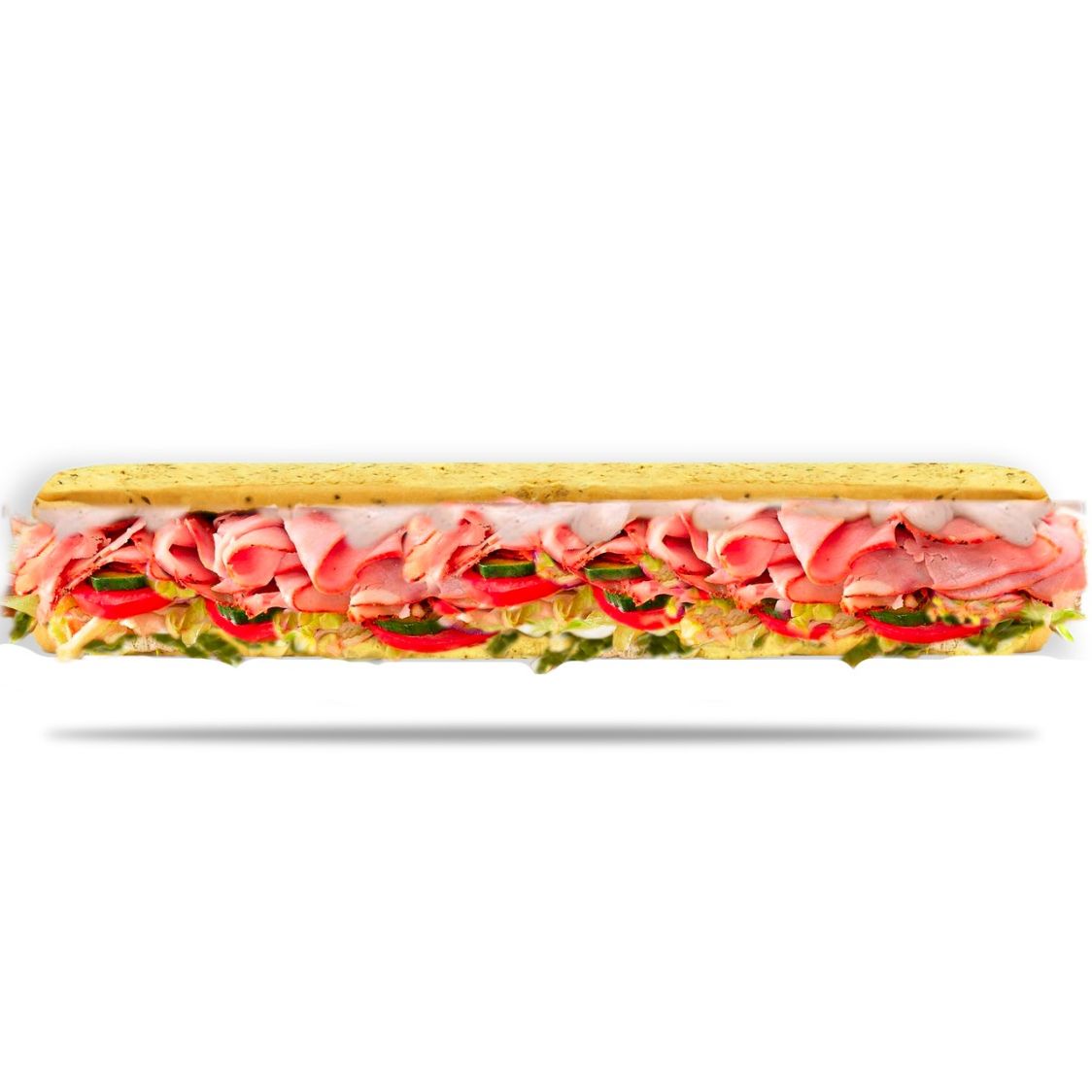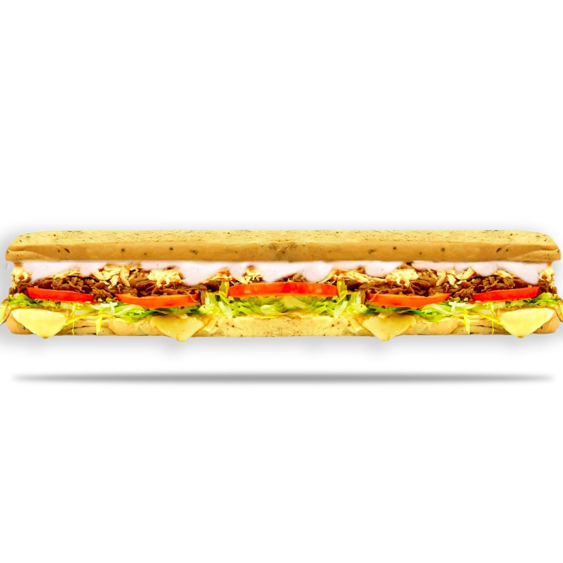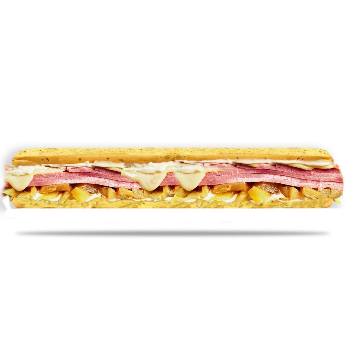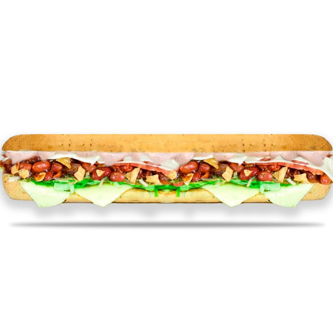 Jamón, salami, pepperoni, lechuga, tomate, queso mozzarella, pimienta, salsa de ajo.