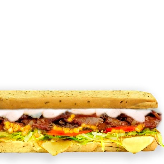 Pollo y carne desmechado, tomate, lechuga, queso mozzarella, salsa B.B.Q, salsa mostaza.