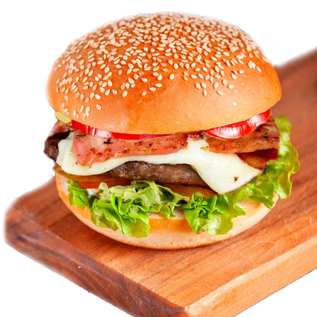 Carne de res, tomate, queso mozzarella, lechuga, cebolla caramelizada, tocineta, salsa BBQ, salsa roja y salsa blanca.