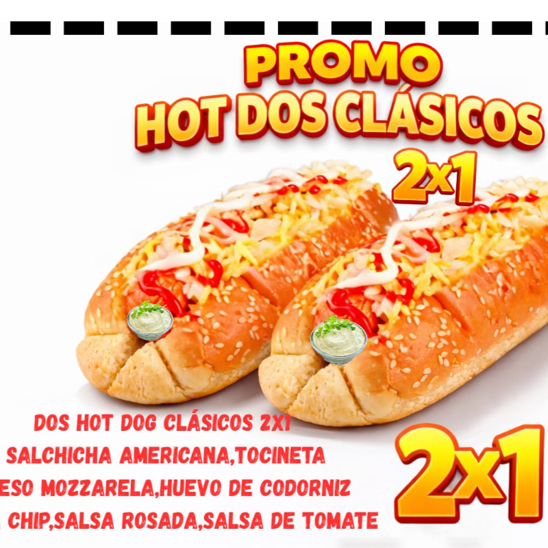 2 hot dog, clasico, salchicha americana, tocineta, queso mozarela, huevo de codorniz, papa chip, salsa rosada y salsa de tomate