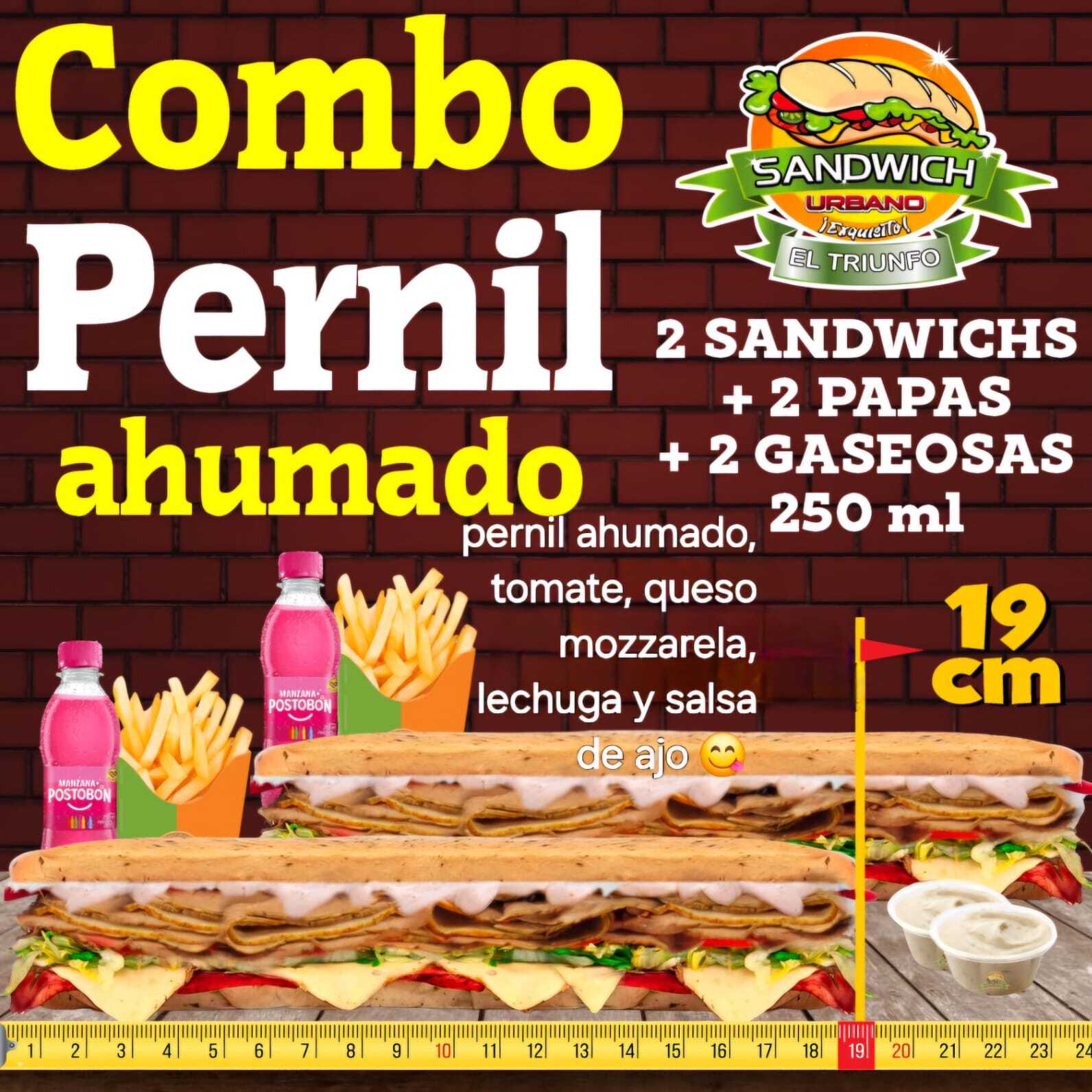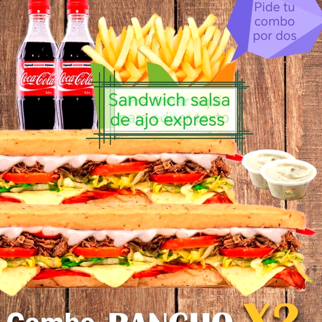 Pernil de cerdo ahumado, tomate, queso mozzarella, lechuga y salsa de ajo. Incluye dos porciones de papas y gaseosa de 250ml.