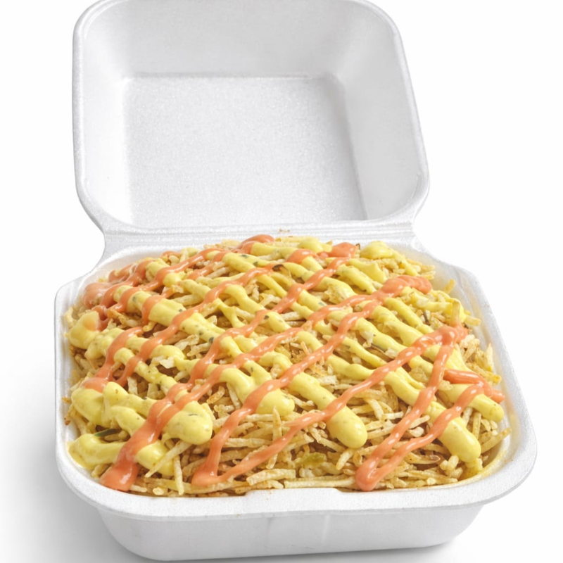 Papas a la francesa (220g), salchicha americana, maíz tierno, alitas BBQ, huevo de codorniz, queso y gaseosa.