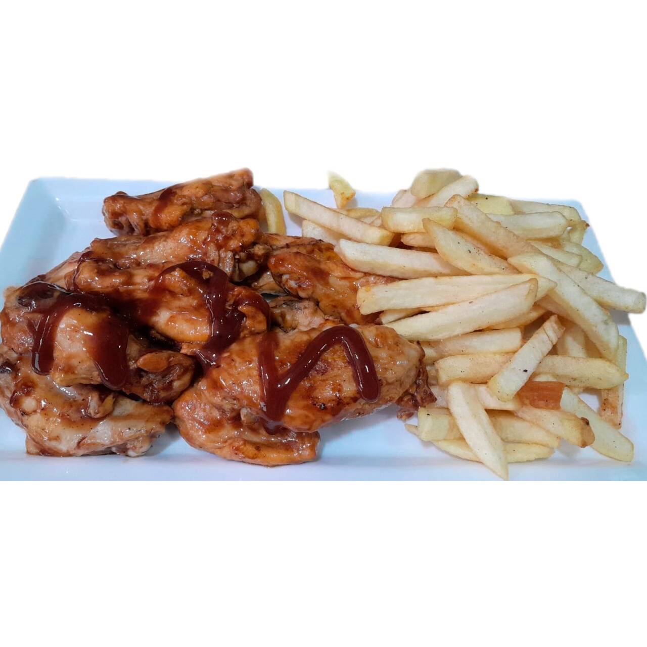 12 Muslitos de alas de pollo en salsa BBQ o miel mostaza, acompañados de papas a la francesa y bebida (gaseosa o limonada).