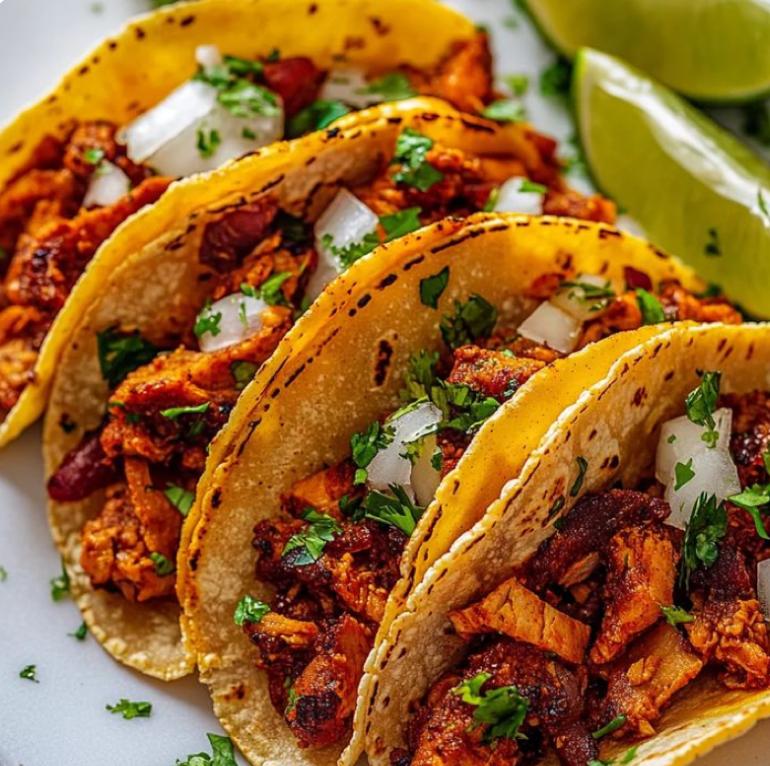 Tres tortillas de maíz, trocitos de lomo de cerdo a la plancha, lechuga, piña asada, queso y pico e' gallo acompañados en salsa de birria.