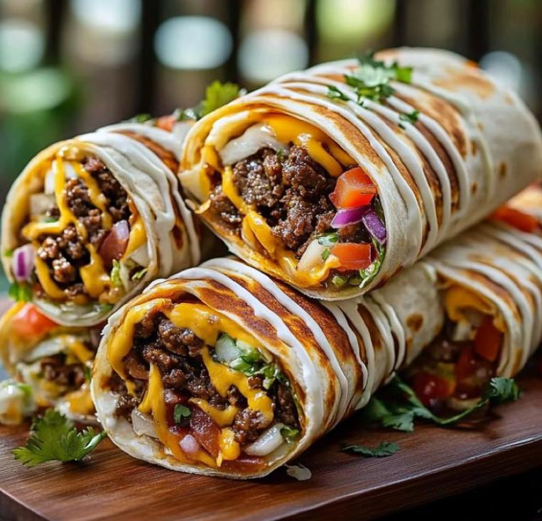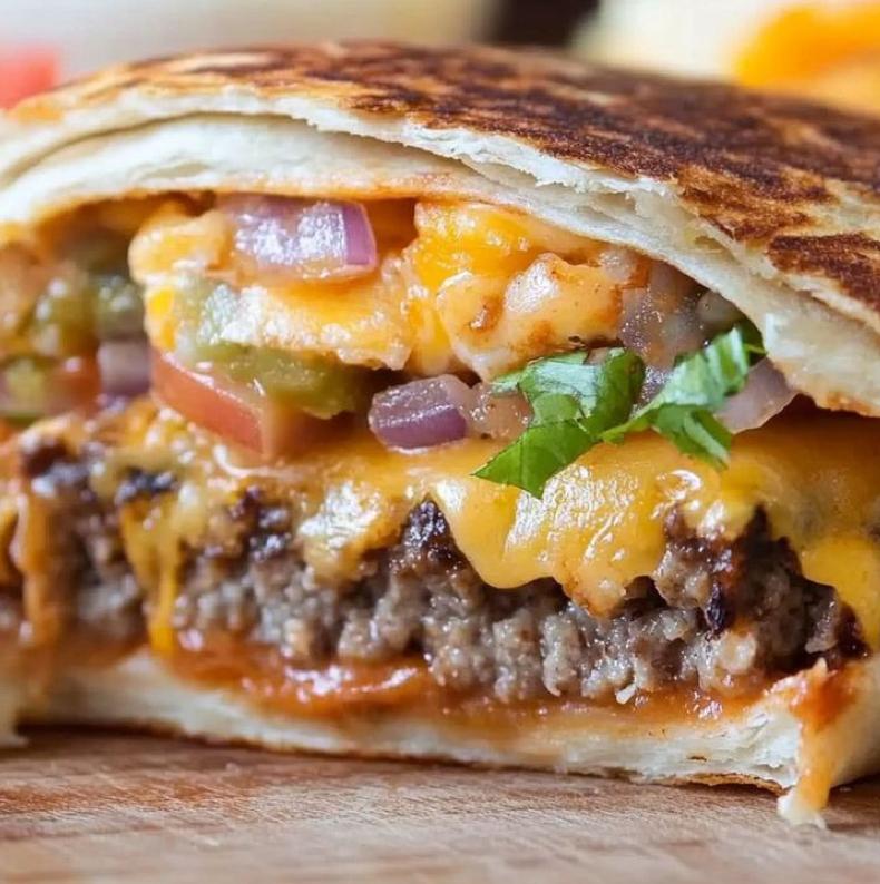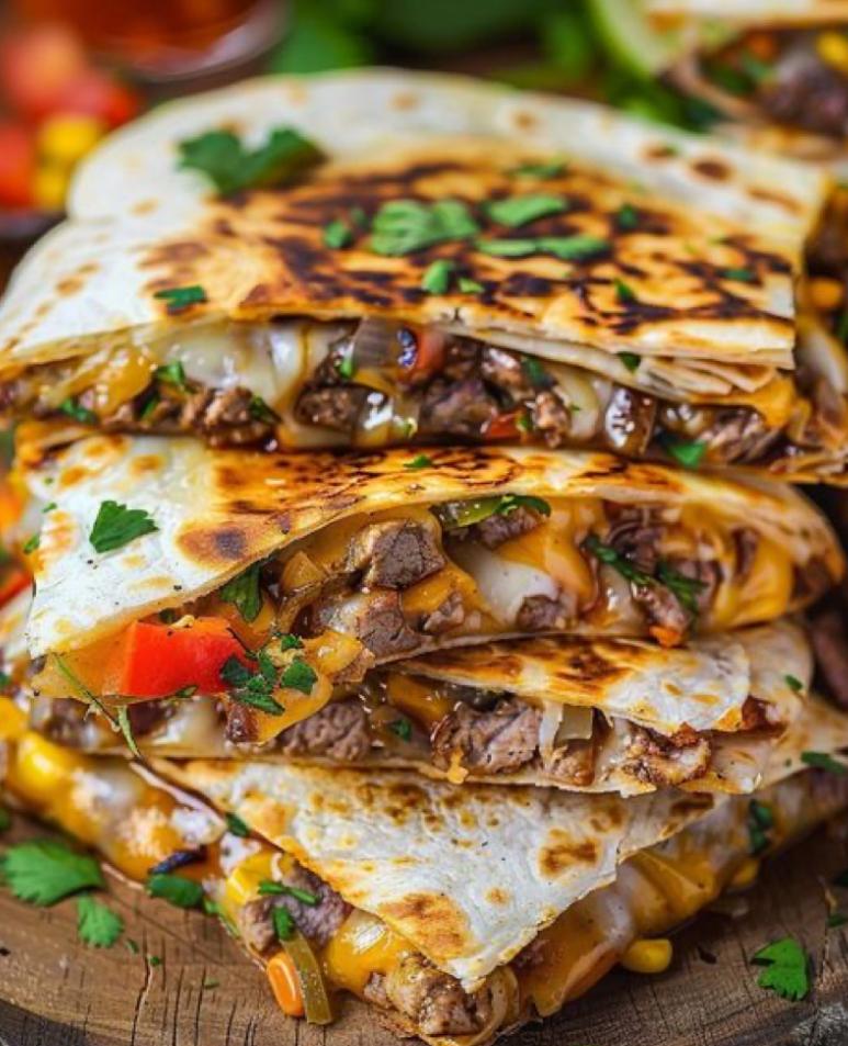 Tortilla crocante a la plancha rellena de pollo y carne desmechada, pico e' gallo y doble queso fundido.