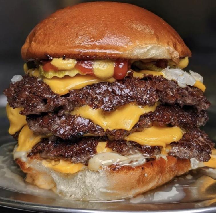 Pan brioche, 180 g de carne artesanal, pechuga asada, costillas en salsa BBQ, doble queso cheddar, vegetales y salsas de la casa.