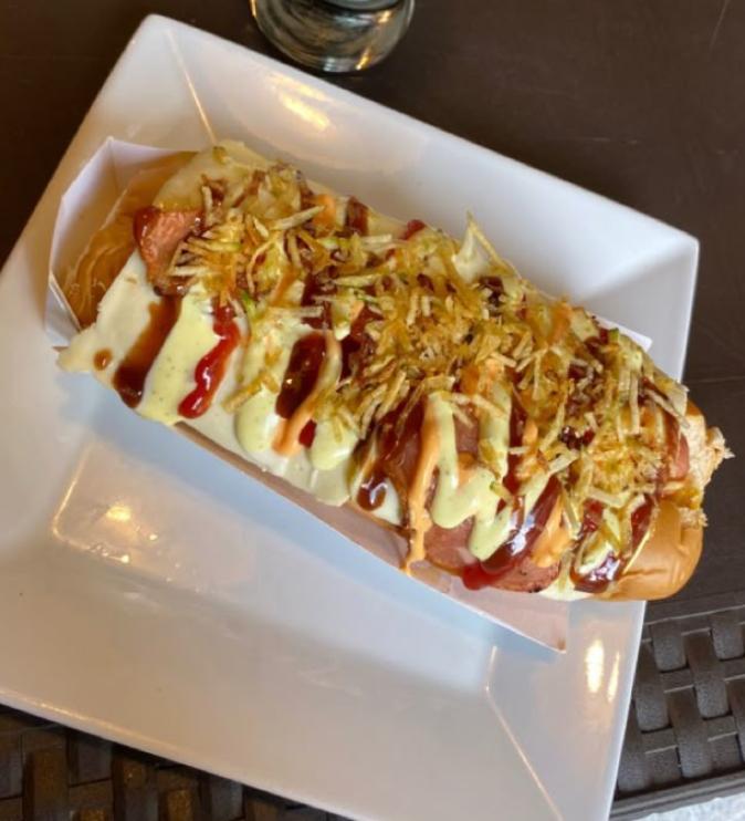 Pan brioche, salchicha americana, queso doble crema, papas chips, carne de hamburguesa, huevo de codorniz, cebolla crispy, tocineta, cebolla caramelizada y salsa de la casa.