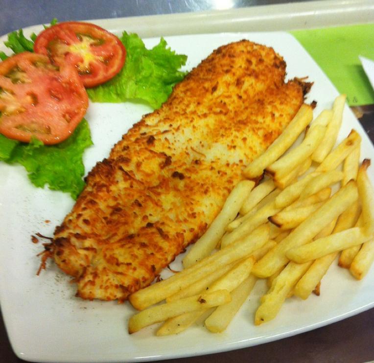 Carne de cerdo apanada acompañada de arroz, ensalada, papas francesas o criolla.