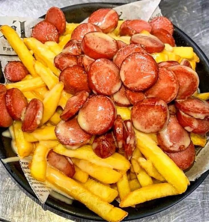 Papas francesas, salchicha americana, queso, huevos de codorniz y salsas.