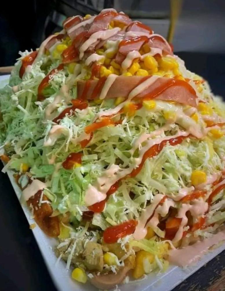 Tortilla crocante rellena de pollo, carne desmechada, salchicha salteada y tocineta bañada en salsas de birria, maíz, lechuga, pico e' gallo, queso fundido y papitas cabello de ángel.