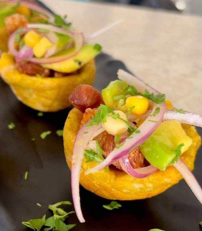 Dos canasticas de patacón rellenas de chicharrón, cebolla roja, cilantro, tomate y trocitos de aguacate.