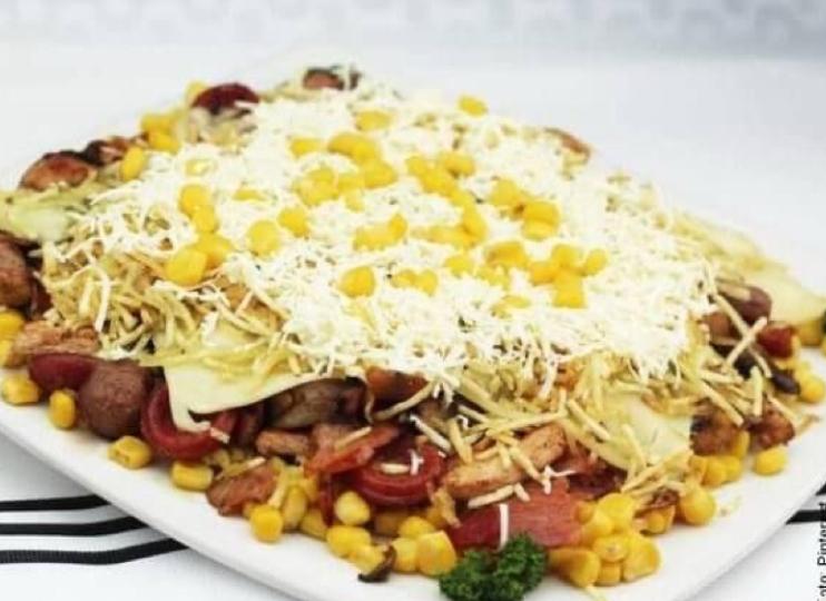 Mazorcada con maíz tierno, queso fundido, trocitos de cerdo, pollo y carne, papas chips y salsas de la casa.